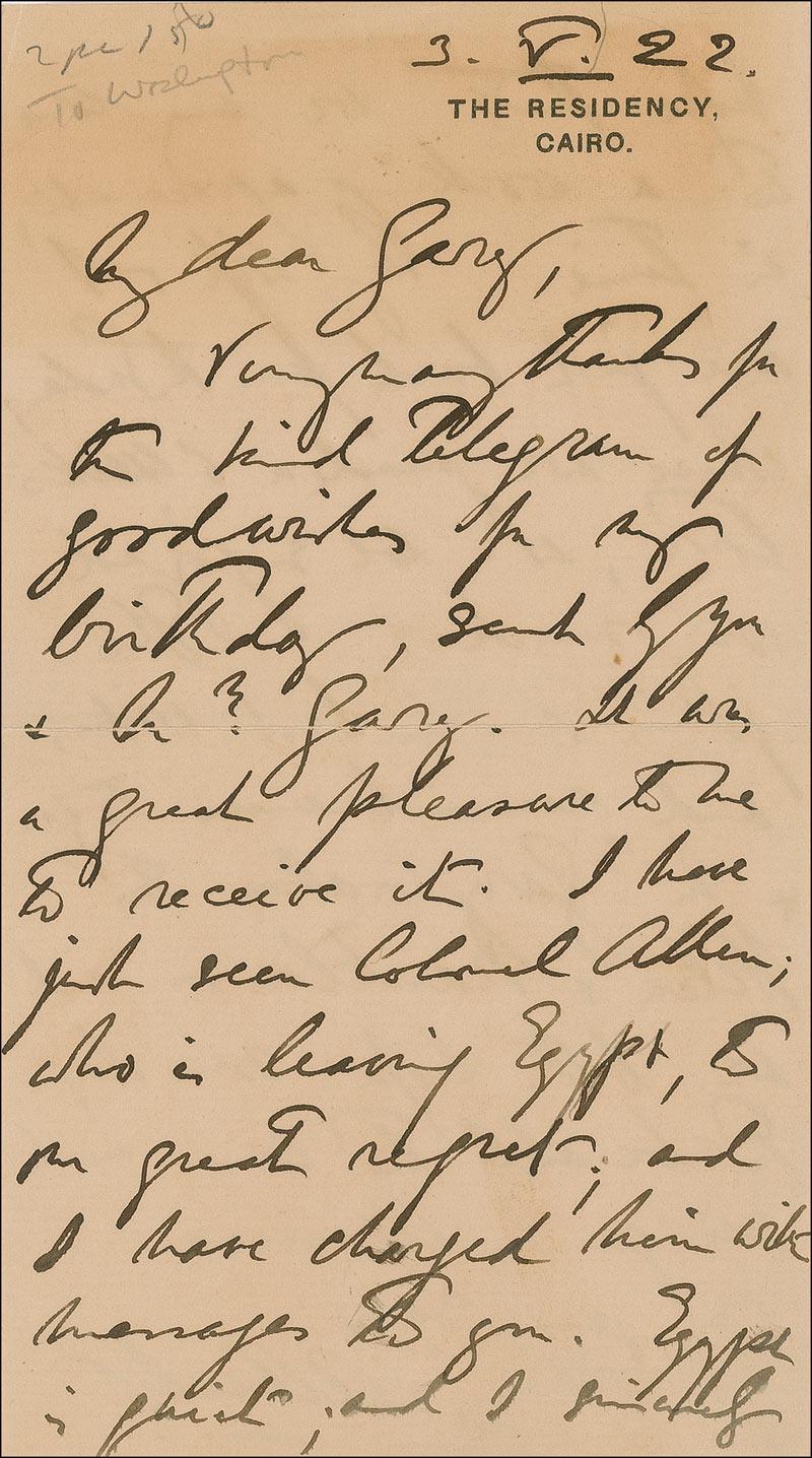 British soldier and administrator (1861–1936) most famous for his role during World War I, in which he led the Egyptian Expeditionary Force in the conquest of Palestine and Syria in 1917 and 1918. ALS signed “Allenby,” one page both sides, 4 x 7.5, The Residency, Cairo letterhead, May 3, 1922. In part: “Very many thanks for the kind telegram of good wishes for my birthday…It was a great pleasure to me to receive it.” In very good condition, with even toning (heavier on the front of the page) and a horizontal fold. Accompanied by the original mailing envelope.