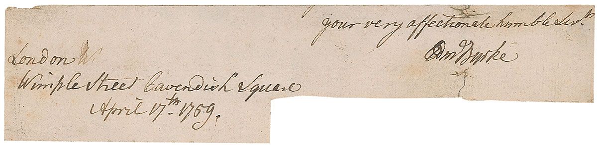 Statesman, author, orator, political theorist, and philosopher (1729–1797) who, after relocating to England, served for many years in the House of Commons. He is mainly remembered for his support of the American Revolution, and for his later opposition to the French Revolution. Ink signature, “Edm. Burke,” on an off-white 7 x 1.75 slip clipped from the close of a letter. Affixed with a portrait to a 7.5 x 6.75 sheet. Light scattered foxing and soiling, otherwise fine condition.