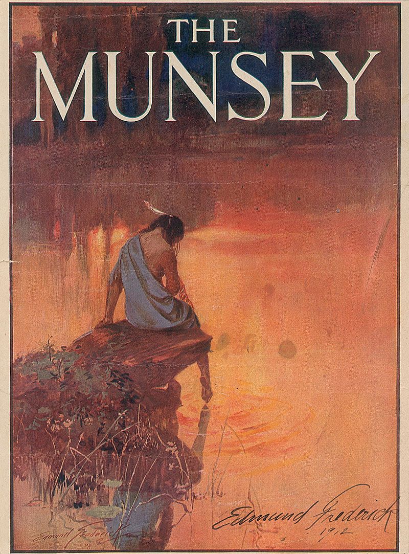 Early 20th century illustrator. Munsey’s Magazine cover featuring one of Frederick’s illustrations, 6.5 x 9, signed in the lower right in black ink, “Edmund Frederick, 1912.” In very good to fine condition, with multiple horizontal folds and a slight tear to the left edge.