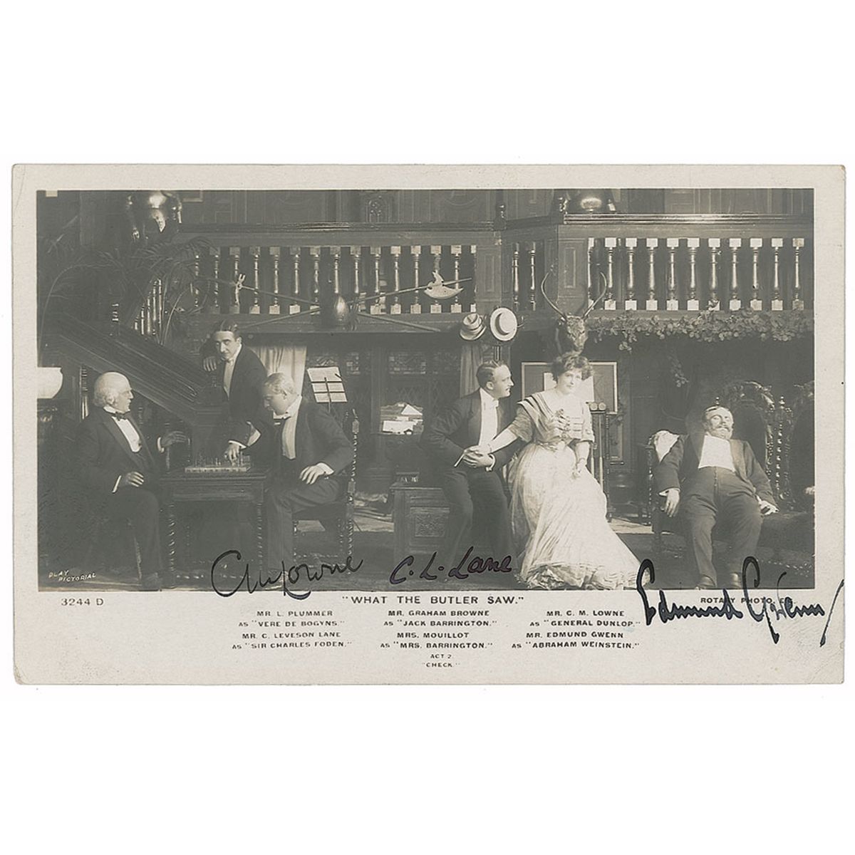 Vintage matte-finish 5.5 x 3.5 postcard photo from the play What the Butler Saw, signed in the bottom border in fountain pen, “Edmund Gwenn,” and also by C. Leveson Lane and C. M. Lowe. In fine condition, with light corner creasing, one of which passes through the end of the signature, and a few light spots of soiling.