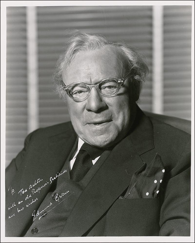 British-born character actor (1875–1959) who won the Academy Award for his supporting role as Kris Kringle in the holiday classic Miracle on 34th Street. Vintage glossy 8 x 10 Warner Bros. publicity photo of Gwenn as he appeared in the horror film Them!, signed and inscribed in white ink “To Ted Ashton, with an old professor’s gratitude and best wishes, Edmund Gwenn.” Binder dings to left edge, a few creases, and surface impressions from caption affixed to the reverse, otherwise fine condition. Ted Ashton, a Princeton graduate, began his motion picture career in 1947 in the publicity department at Warner Brothers. He soon became a unit publicist on many of the studios most successful films for the next 18 years. Among his many credits were Giant, Mister Roberts, Auntie Mame, East of Eden, Calamity Jane, The Green Berets, and Bound for Glory. Pre-certified PSA/DNA and RRAuction COA.