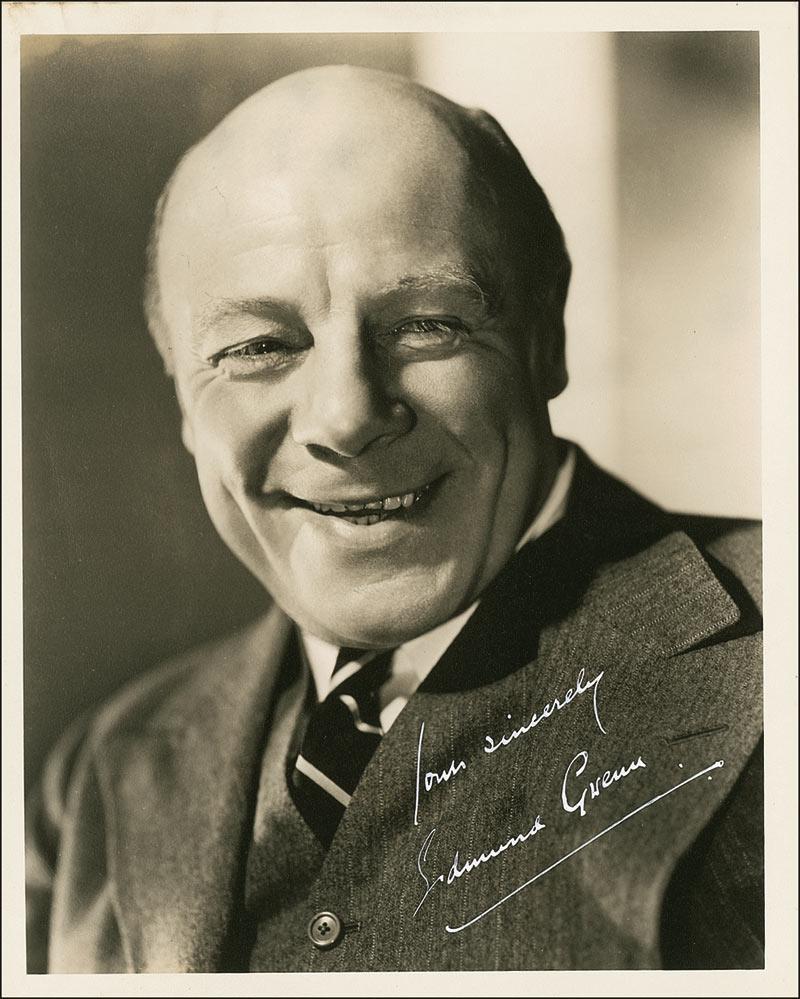 British-born character actor (1875–1959) who won the Academy Award for his supporting role as Kris Kringle in the holiday classic Miracle on 34th Street. Vintage matte-finish 8 x 10 photo of a smiling Gwenn, signed in white ink, “Yours sincerely, Edmund Gwenn.” In fine condition, with creasing to lower left corner and residue at the top left corner. Pre-certified PSA/DNA and RRAuction COA.