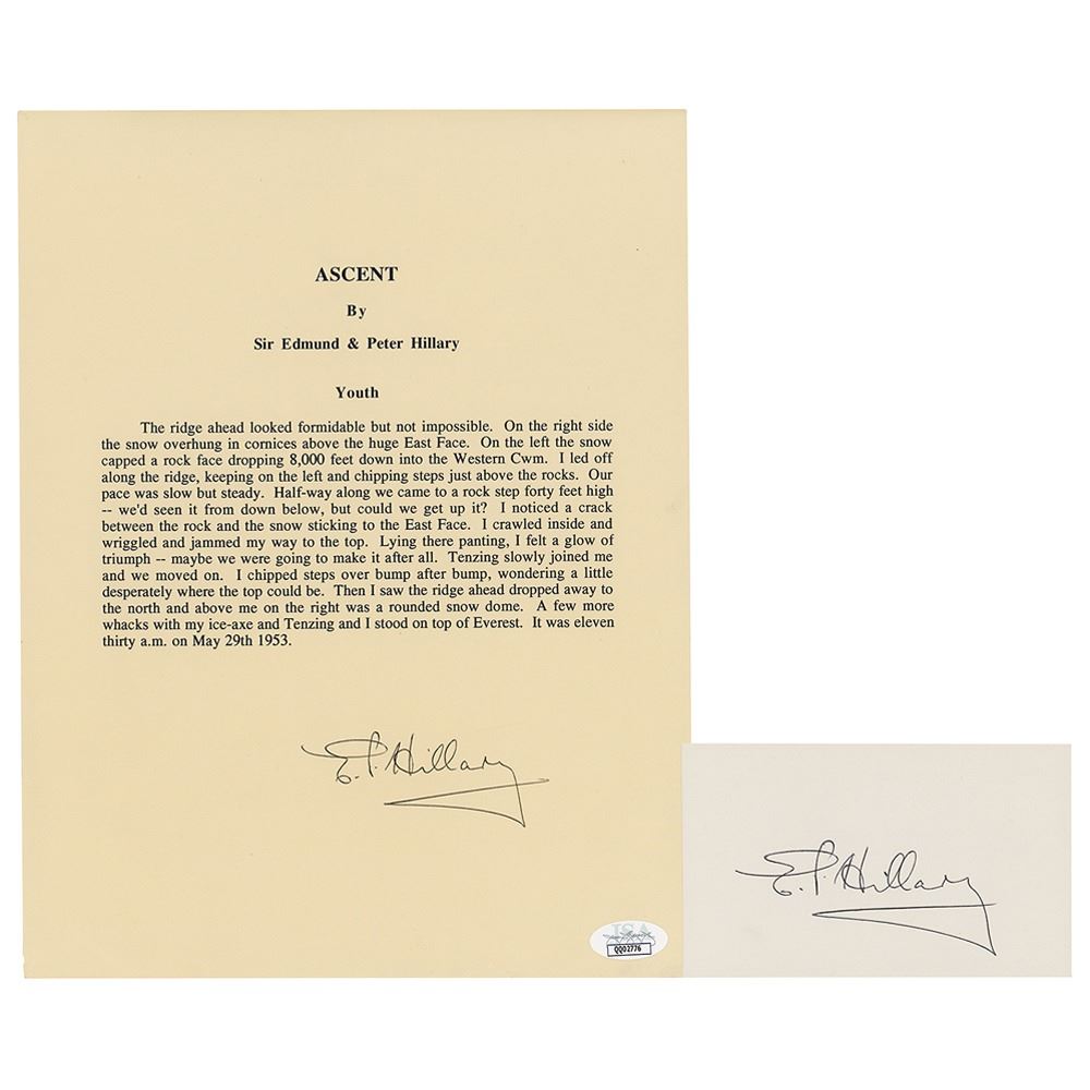 Two items: a souvenir typescript of a passage from the book Ascent: Two Lives Explored: The Autobiographies of Sir Edmund and Peter Hillary, one page, 8.5 x 11, signed at the conclusion in black ballpoint, “E. P. Hillary”; and a neat ballpoint signature, “E. P. Hillary,” on an off-white 5 x 3 card. In overall fine condition, with a JSA authenticity label affixed to the lower right corner of the typescript. Accompanied by a certificate of authenticity from JSA.