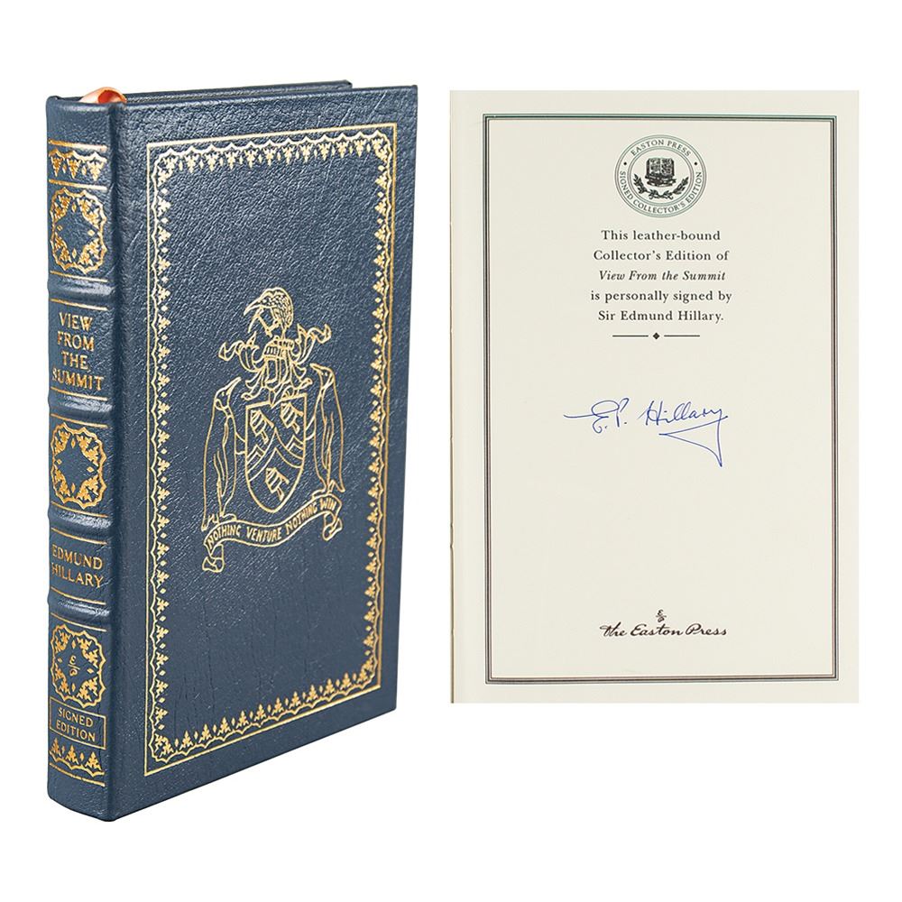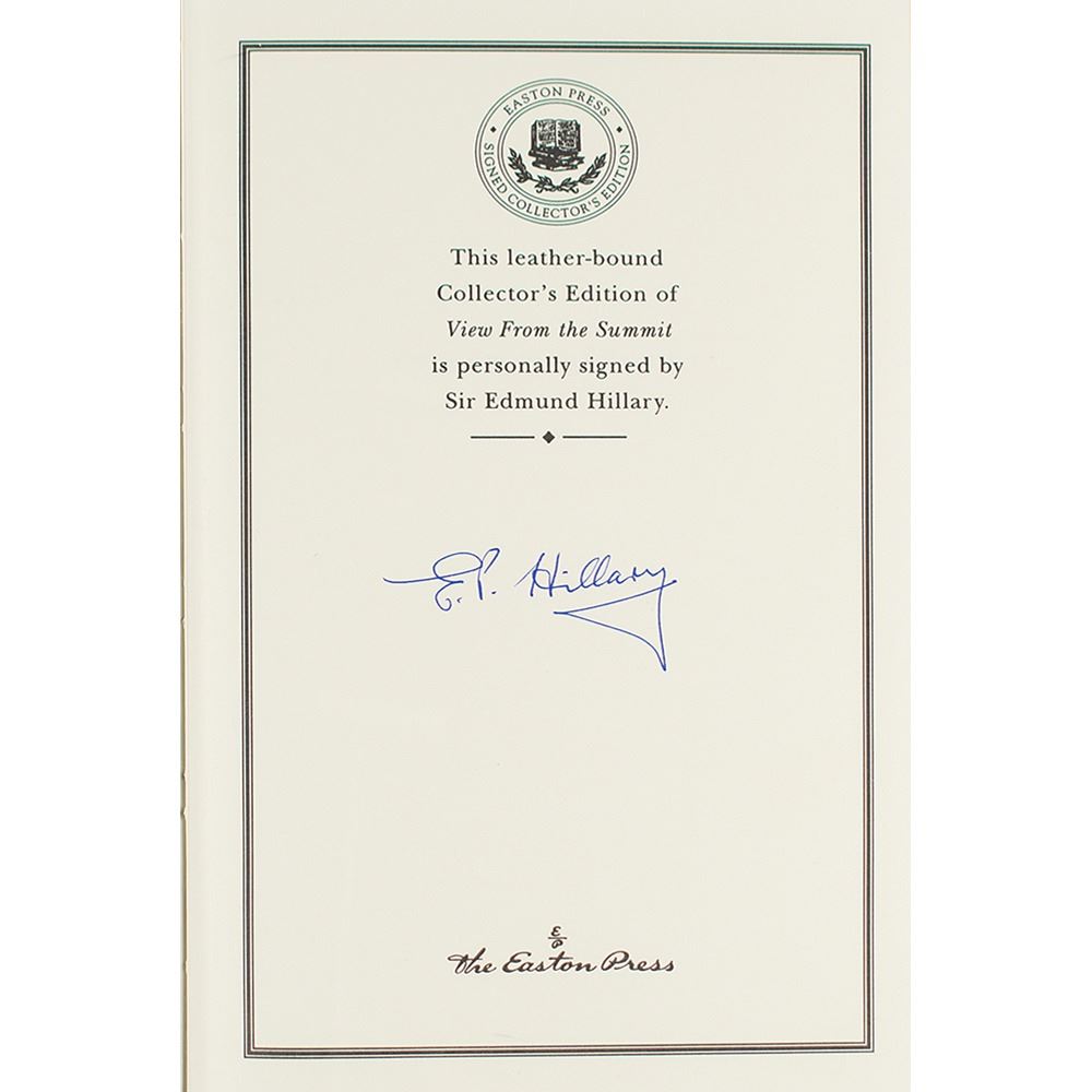 Signed book: View from the Summit. Collector's edition. Norwalk, CT: Easton Press, 1999. Leather-bound hardcover, 6.5 x 9.5, 310 pages. Signed on the colophon in blue ink, "E. P. Hillary." In very fine condition. Accompanied by the publisher's certificate of authenticity.