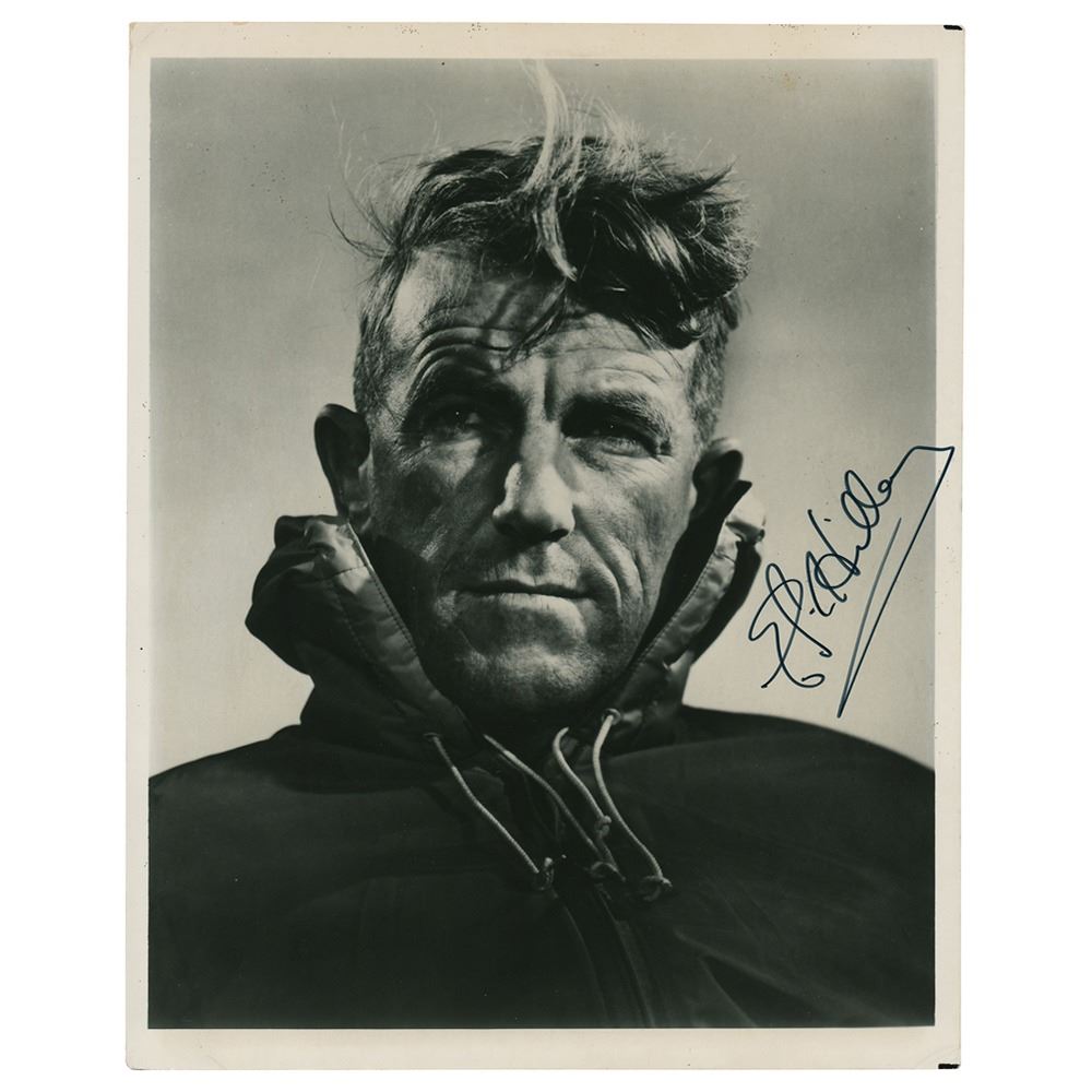 Iconic glossy 8 x 10 close-up portrait of the Everest climber in his coat, signed in black felt tip, "E. P. Hillary." In very good to fine condition, with scattered light creasing and surface impressions.