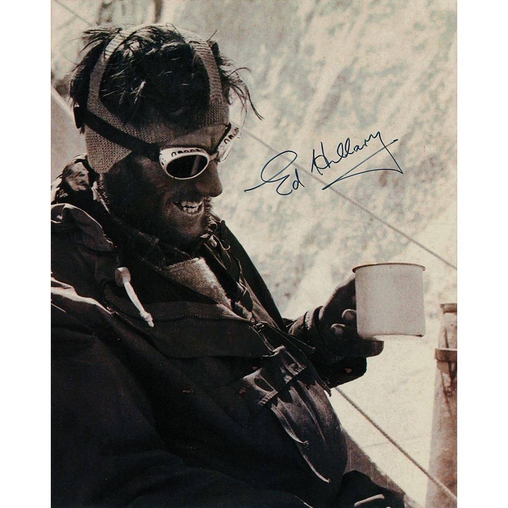 Glossy 8 x 10 photo of Hilllary enjoying a hot cup of coffee while scaling a mountain, signed in black felt tip, "Ed Hillary." In very good to fine condition, with small surface gouges across the bottom, and some creasing to the top edge.