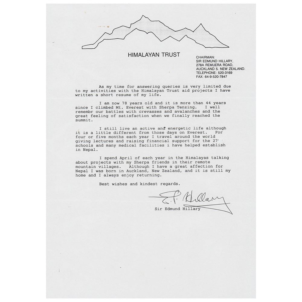 TLS signed “E. P. Hillary,†one page, 8.25 x 11.75, Himalayan Trust letterhead, postmarked September 24, 1997. Letter to Ellen Musgrave, in part: "I am now 78 years old and it is more than 44 years since I climbed Mt. Everest with Sherpa Tenzing. I well remember our battles with crevasses and avalanches and the great feeling of satisfaction when we finally reached the summit. I still live an active and energetic life although it is a little different from those days on Everest. For four or five months each year I travel around the world giving lectures and raising financial support for the 27 schools and many medicinal facilities I have helped establish in Nepal. I spend April of each year in the Himalayas talking about projects with my Sherpa friends in their remote mountain villages. Although I have a great affection for Nepal, I was born in Auckland, New Zealand, and it is still my home and I always enjoy returning." In fine condition, with light creasing to the left side. Accompanied by the original mailing envelope.