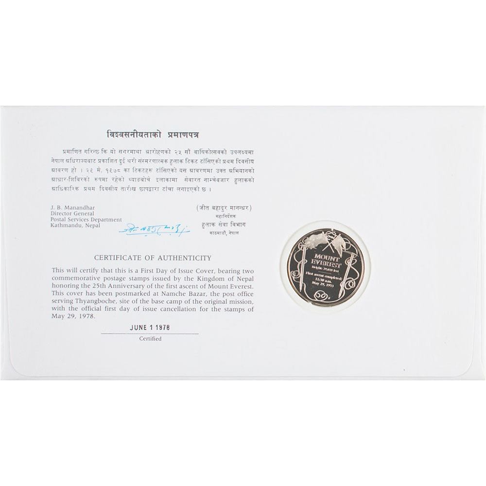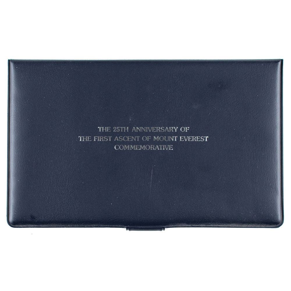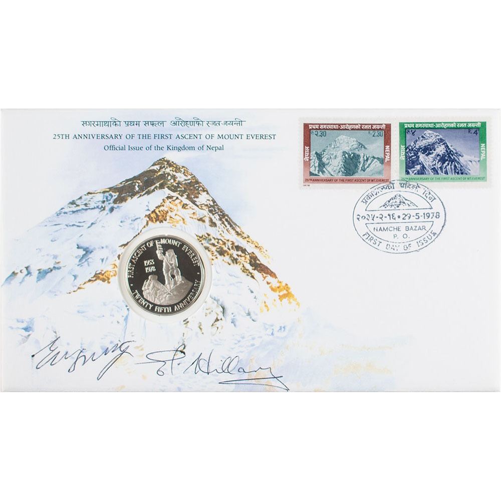 Commemorative cover with a cachet and inlaid medallion honoring the 25th anniversary of the first ascent of Mount Everest, 8 x 4.5, signed in black ballpoint by Edmund Hillary and Tenzing Norgay. Housed in its original presentation folder. In very fine condition.