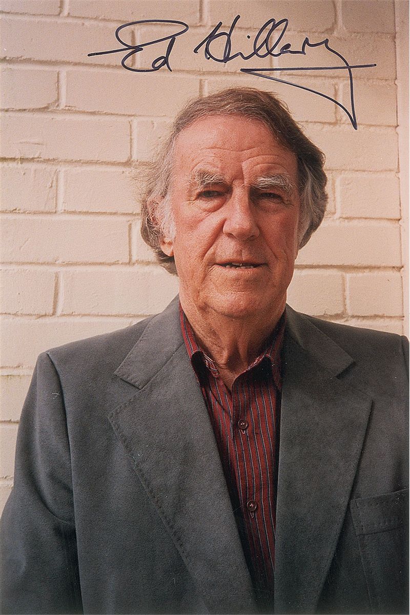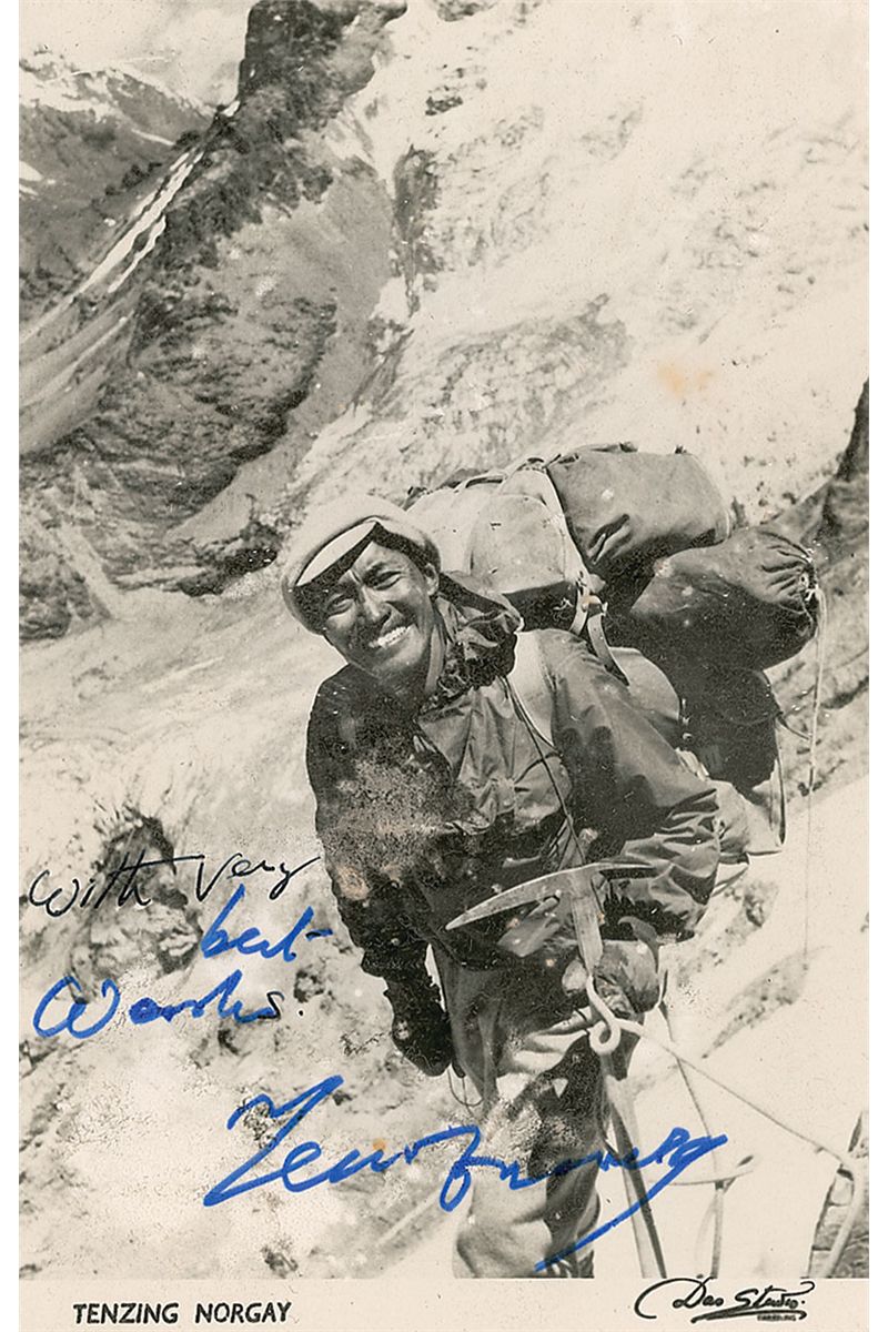 Color satin-finish 4 x 6 photo of Hillary later in life, signed in black felt tip, “Ed Hillary”; and a 3.5 x 5.5 cardstock photo of Norgay scaling a mountain, signed in blue felt tip, “Best wishes, Tenzing Norgay.” In overall fine condition.