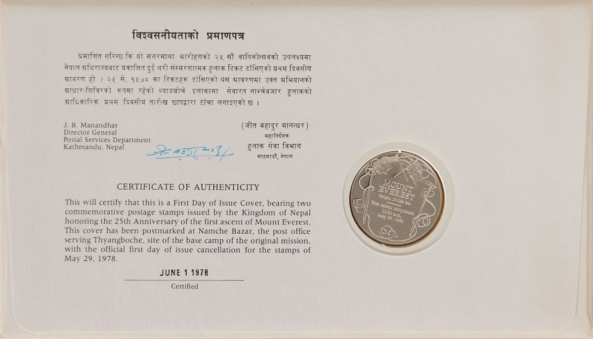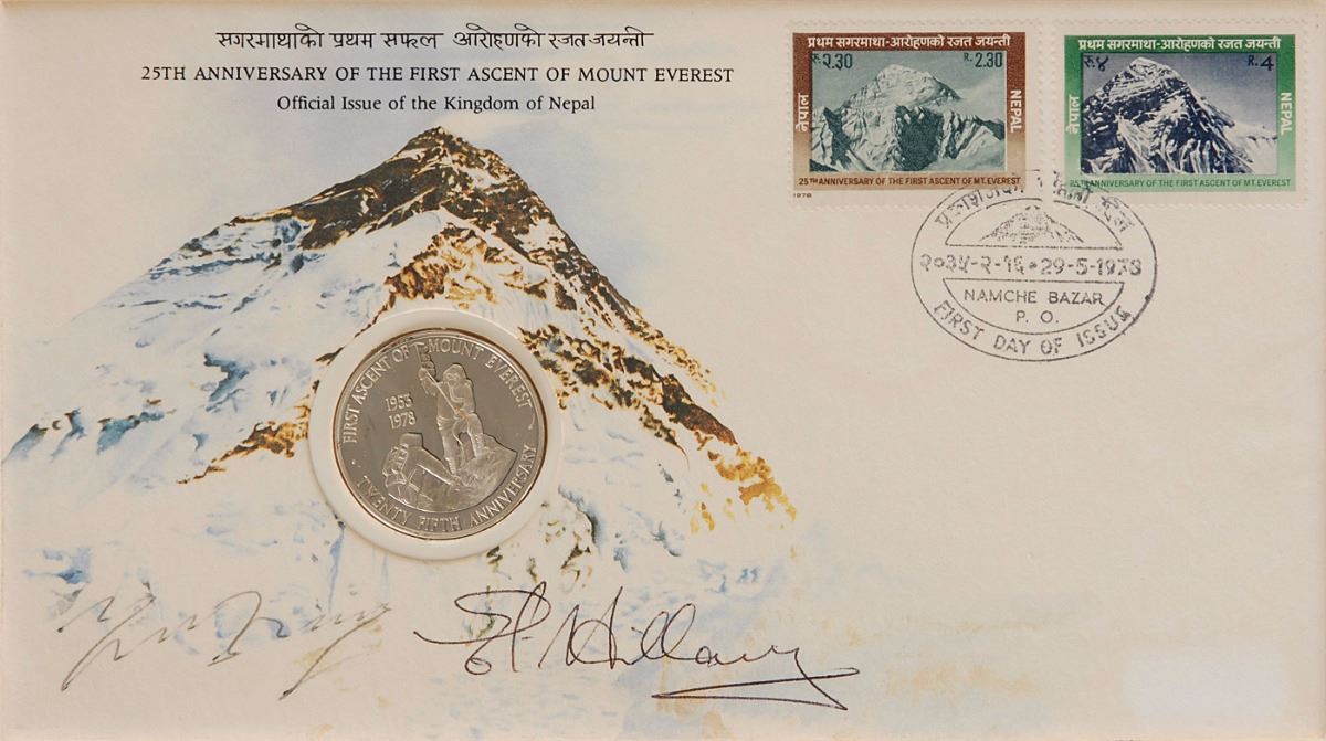 FDC with a cachet and inlaid medallion honoring the 25th anniversary of the first ascent of Mount Everest, signed in black ballpoint by Hillary and Norgay. Housed in its original presentation folder. In fine condition.