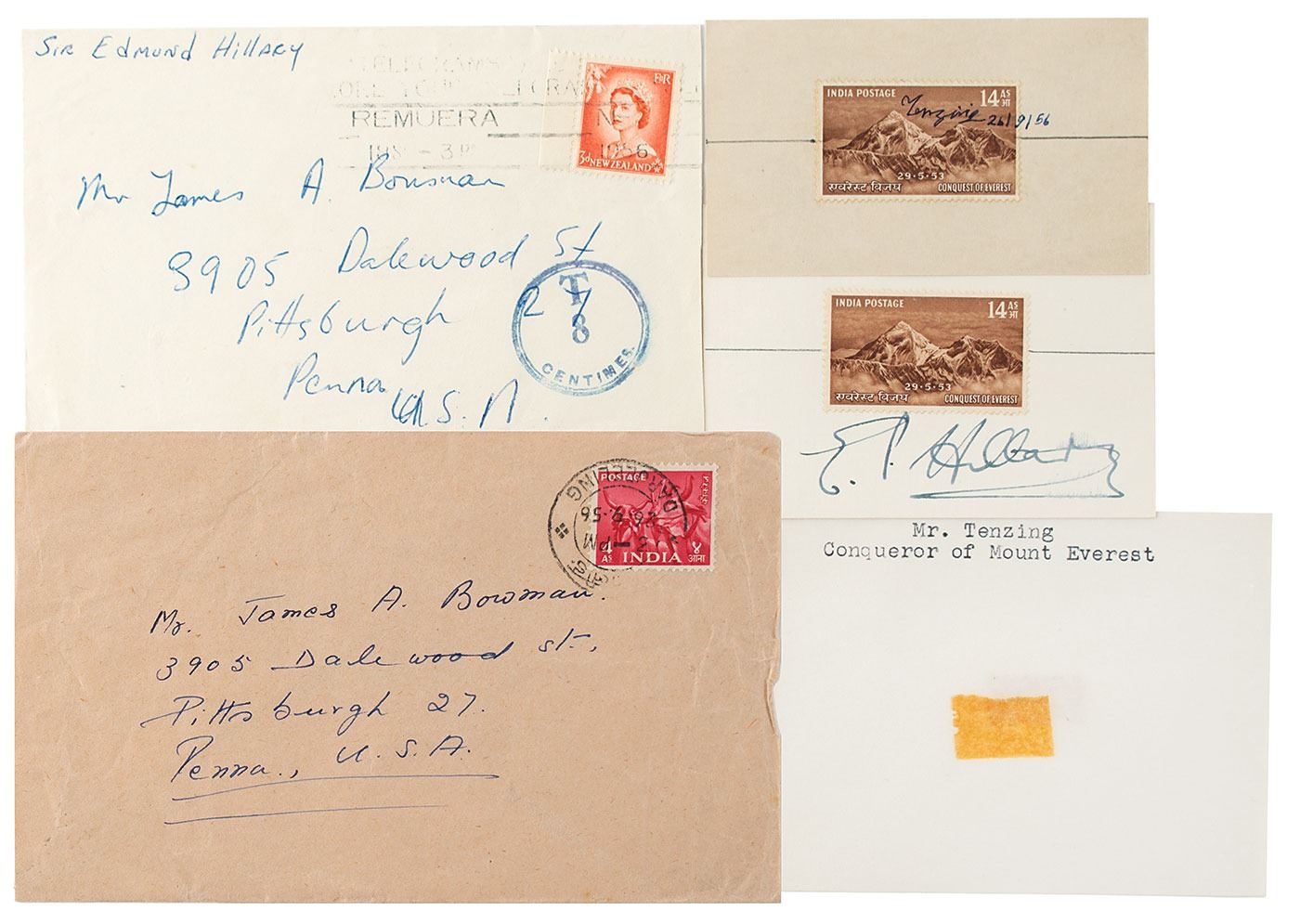 Desirable pair of vintage signatures: a fountain pen signature, "E. P. Hillary," on an off-white 3.5 x 2.5 card bearing an affixed Indian postage stamp honoring the conquest of Everest; and a fountain pen signature, "Tenzing, 26/9/56," over an Indian postage stamp honoring the conquest of Everest, affixed to a 3.5 x 2 card. In overall fine condition. Accompanied by both original mailing envelopes.
