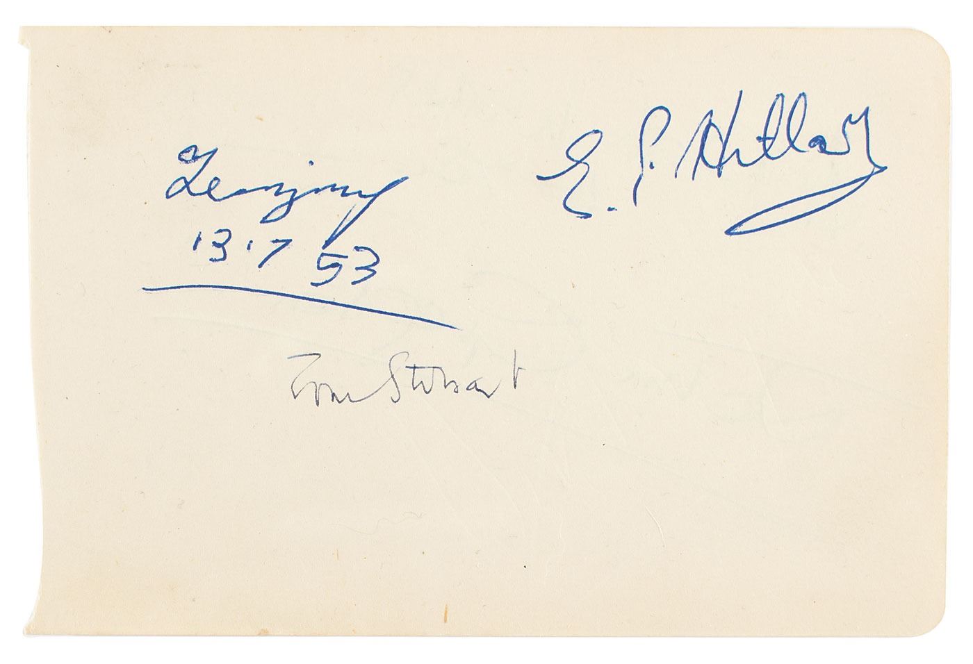 Vintage ink signatures, "E. P. Hillary" and "Tenzing, 13. 7. 53,” on an off-white 6.25 x 4 album page, which is also signed by Tom Stobart, a British cameraman, filmmaker, and author, notable for having shot The Conquest of Everest, the official film of the 1953 British Mount Everest Expedition. In fine condition.