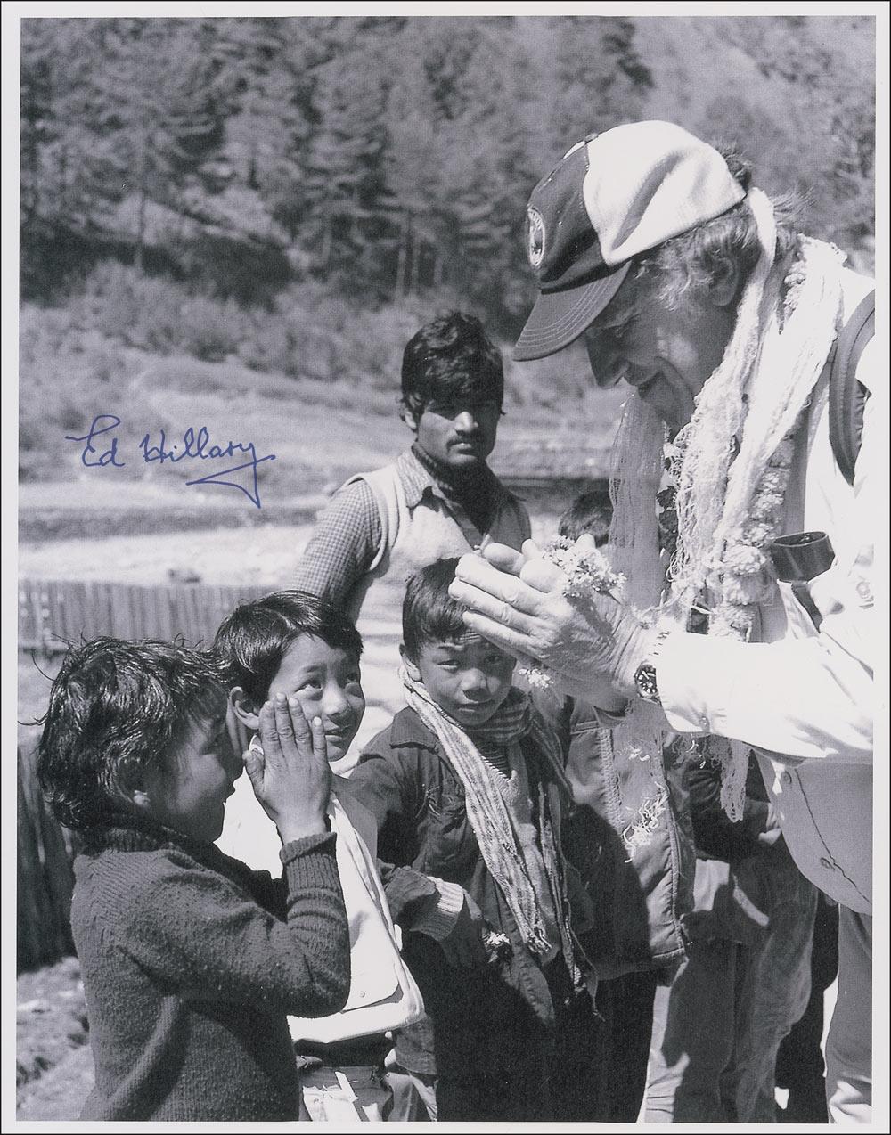 Satin-finish 11 x 14 photo of Hillary accepting flowers from several young children, signed in blue felt tip. In very fine condition.