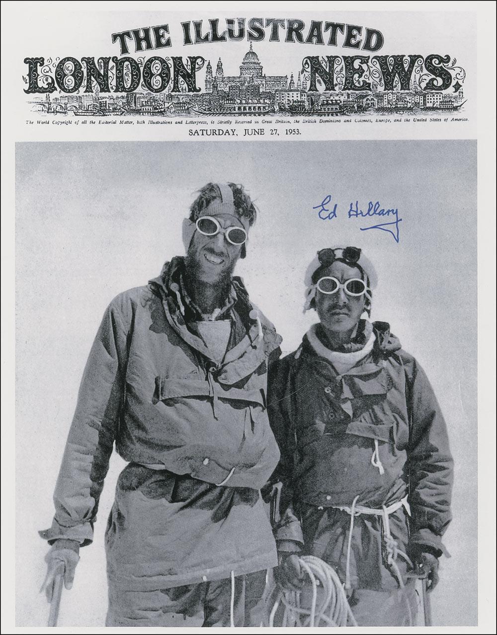 Satin-finish 11 x 14 photo of the June 27, 1953, issue of the Illustrated London News featuring Hillary and Norgay after their successful ascent of Everest, signed in blue felt tip by Hillary. In very fine condition.