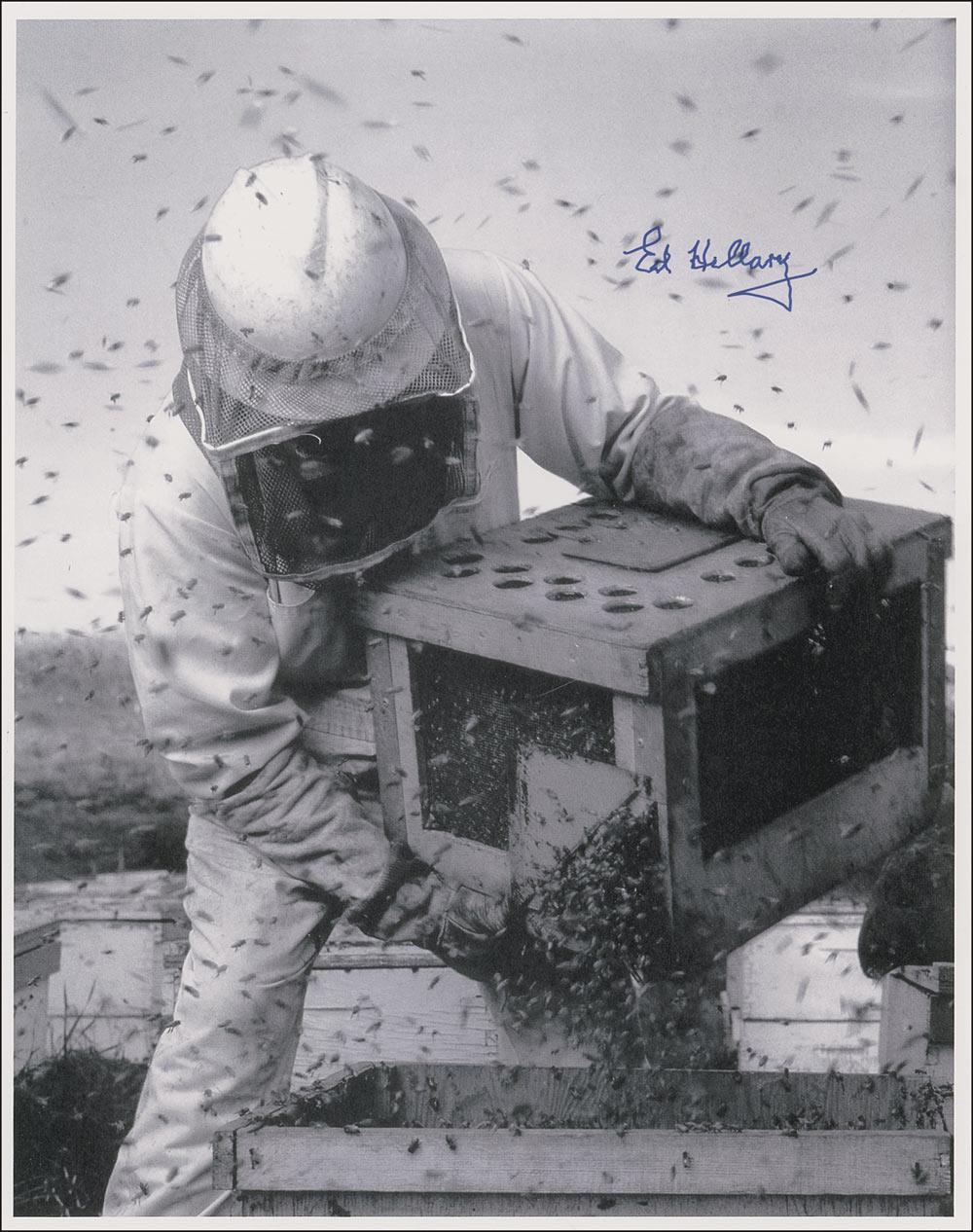 Satin-finish 11 x 14 photo of Hillary in his profession as a bee keeper, signed in blue felt tip. In very fine condition.