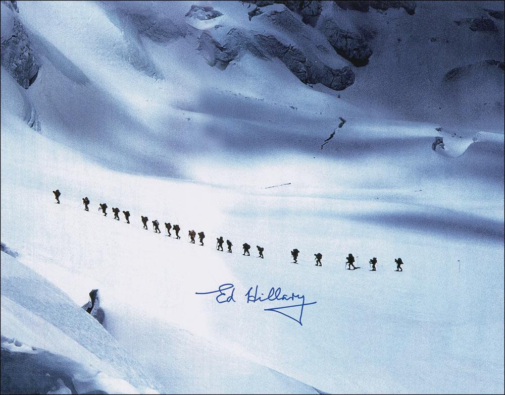 Breath-taking color satin-finish 14 x 11 photo of Hillary and his team ascending a slope on Everest, signed in blue felt tip. In very fine condition.