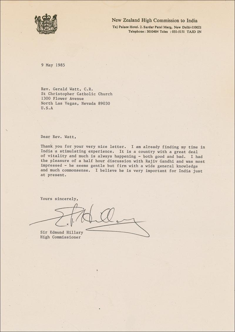 TLS signed “E. P. Hillary,” one page, 8.25 x 11.75, New Zealand High Commission to India letterhead, May 9, 1985. Letter to a reverend in Las Vegas. In part: “I am already finding my time in India a stimulating experience. It is a country with a great deal of vitality and much is always happening–both good and bad. I had the pleasure of a half hour discussion with Rajiv Gandhi and was most impressed–he seems gentle but firm with a wide general knowledge and much commonsense. I believe he is very important for India just at present.” Mild toning to upper portion of letter, otherwise fine condition.