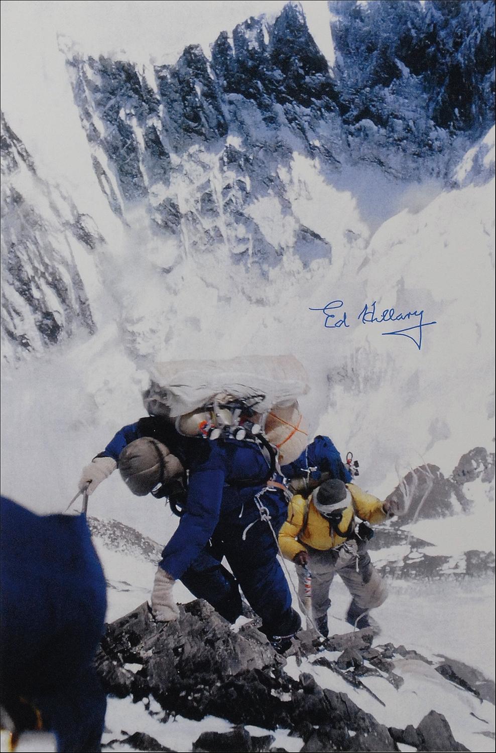 Excellent color satin-finish 12 x 18 photo of Hillary and Norgay ascending Mount Everest, signed in blue felt tip, “Ed Hillary.” In very fine condition.