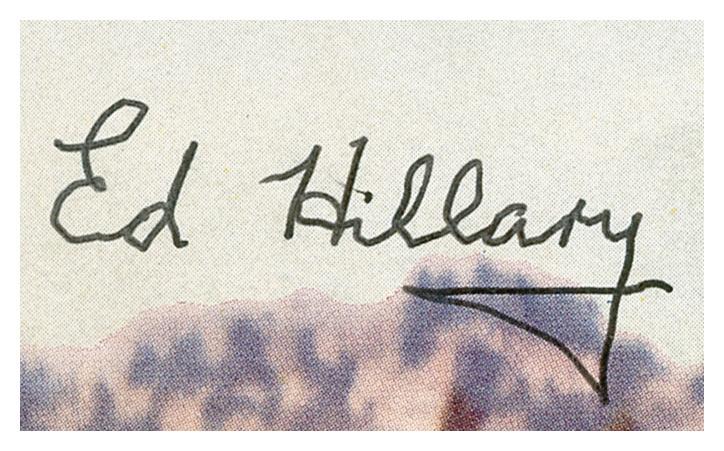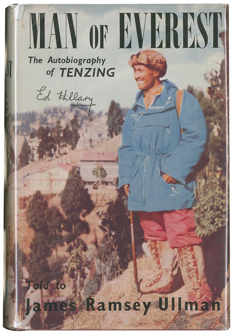 Signed book: Man of Everest: The Autobiography of Tenzing. First edition, first printing. London: George G. Harrap & Co., 1955. Hardcover with dustjacket, 5.75 x 8.5, 320 pages. Signed on the front cover of the dustjacket in black ink by Hillary. In fine condition, with bookplate affixed to first free end page, price clip to dustjacket, and edge wear and a few chips to jacket .