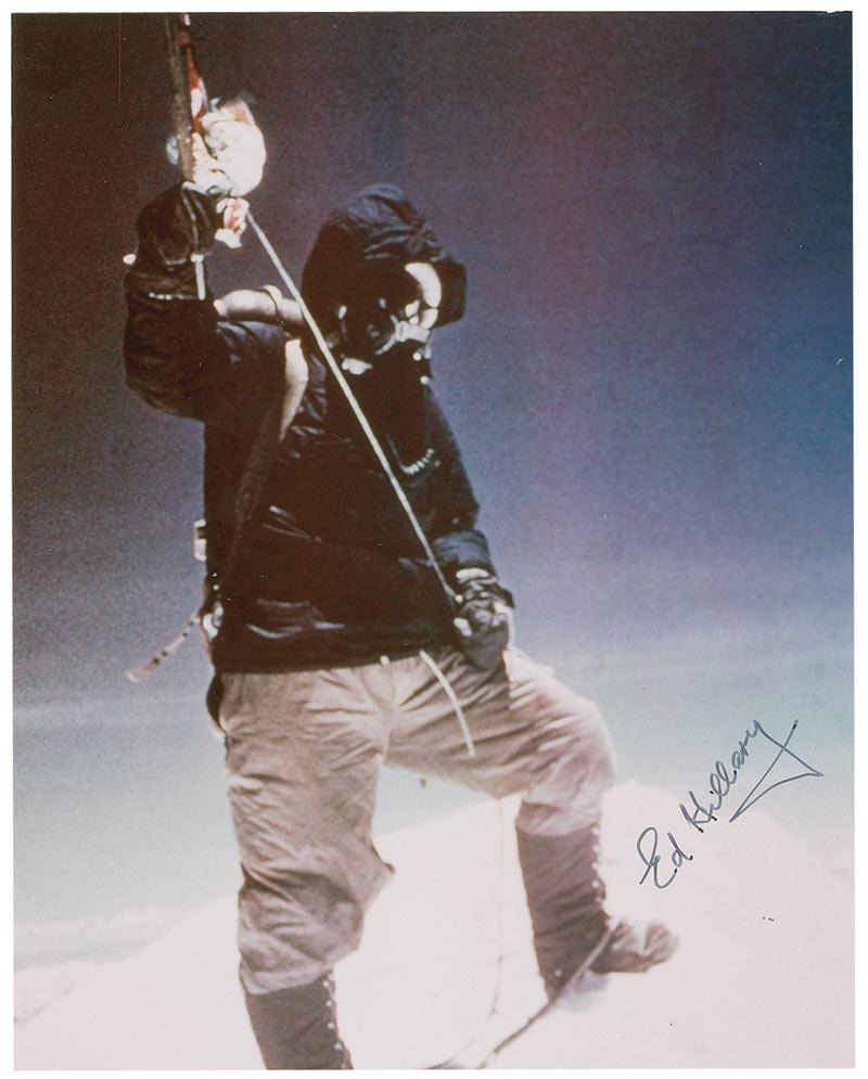 Color satin-finish 8 x 10 photo of Norgay atop Mount Everest, signed in black felt tip, “Ed Hillary.” In fine condition, with a few trivial edge dings.