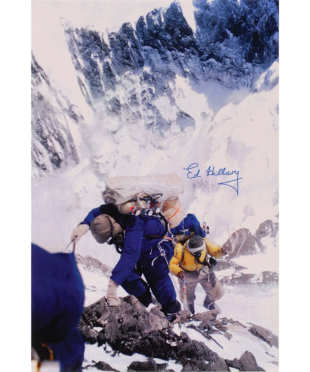 Color satin-finish 12 x 18 photo of Hillary and Norgay ascending Mount Everest, signed in blue felt tip. In very fine condition.