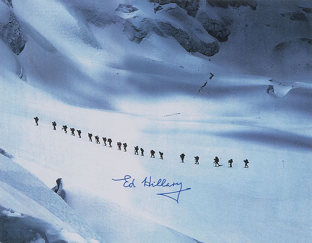 Color satin-finish 14 x 11 photo of the climbers beginning their ascent, signed in blue felt tip. In very fine condition, with a slightly grainy quality to the image.