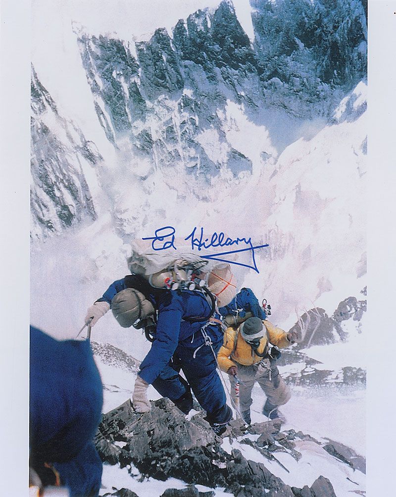 Color glossy 8 x 10 photo of Hilary and Norgay ascending Everest, signed in blue felt tip. In fine condition.