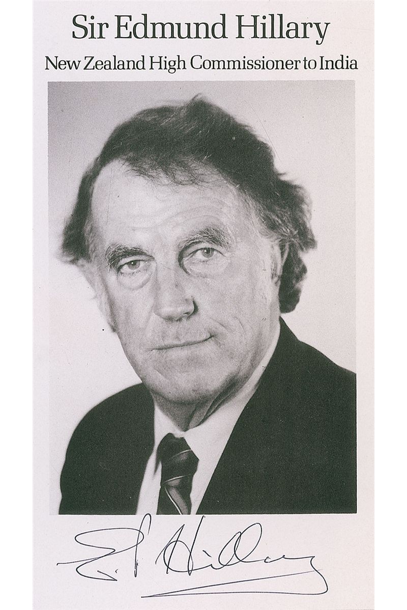 Distinguished 3.5 x 6.25 cardstock photo of Hillary, signed in black ballpoint in the lower border, “E. P. Hillary.” In fine condition.