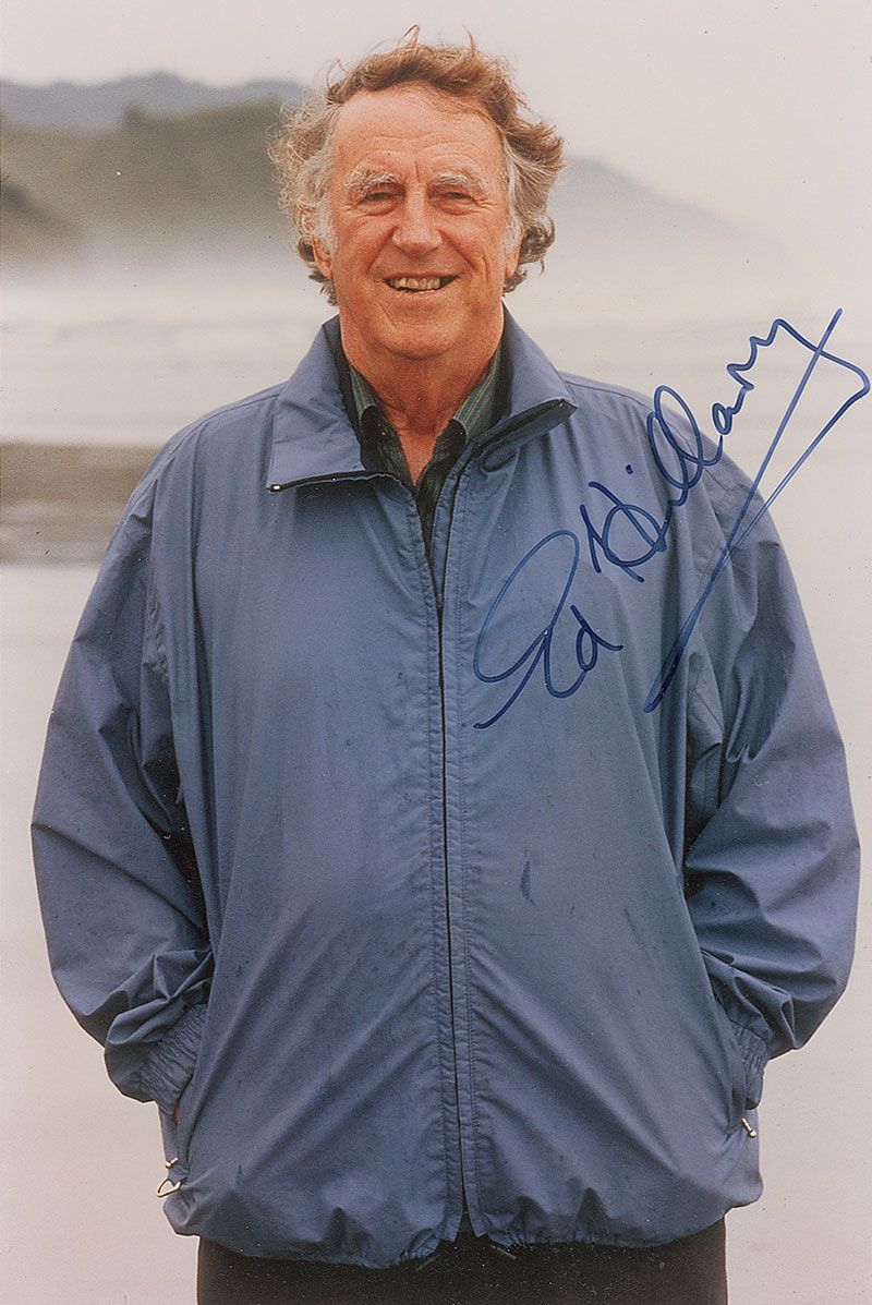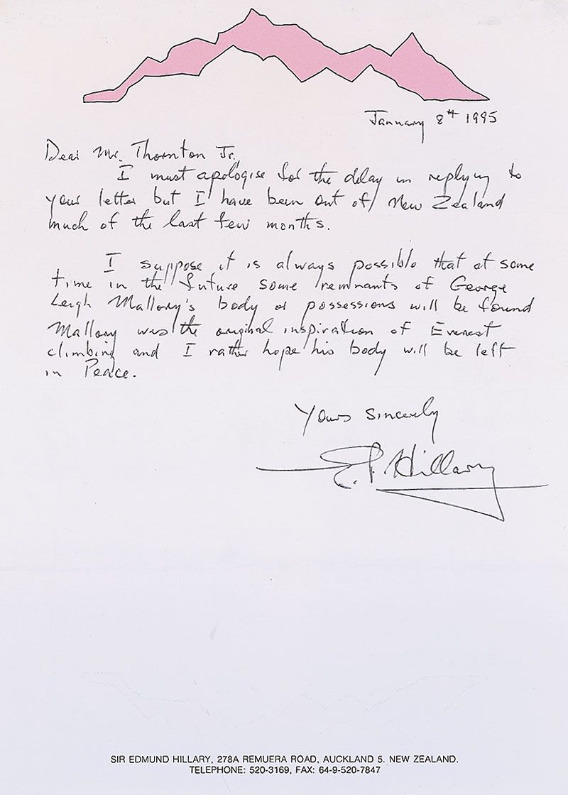 Two items: TLS, signed “E. P. Hillary,” one page, 8.5 x 11, mountain letterhead, dated January 8, 1995. Letter to a collector reads, in part: “I suppose it is always possible that at some time in the future some remnants of George Leigh Mallory’s body or possessions will be found. Mallory was the original inspiration of Everest climbing and I rather hope his body will be left in peace.” Accompanied by the original mailing envelope; and a color glossy 4 x 6 photo of Hillary, signed in black felt tip. In fine condition.