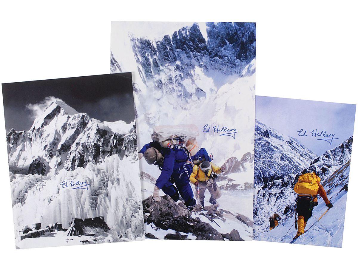 Three different majestic satin-finish photos of Hillary’s ascent of Everest, including two oversized, each signed in blue felt tip. In fine condition.