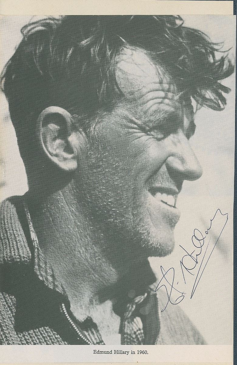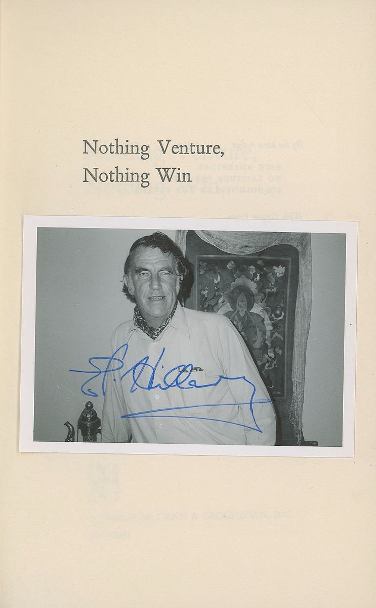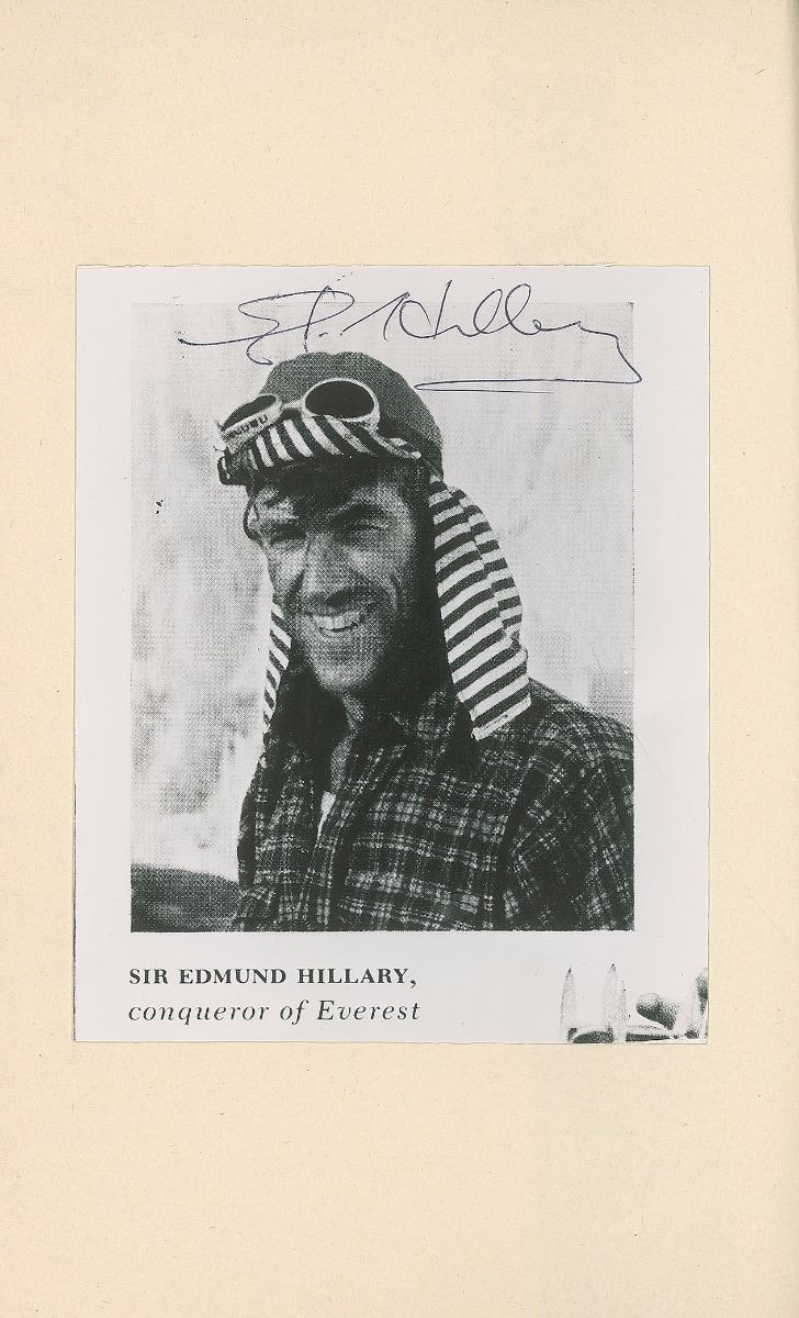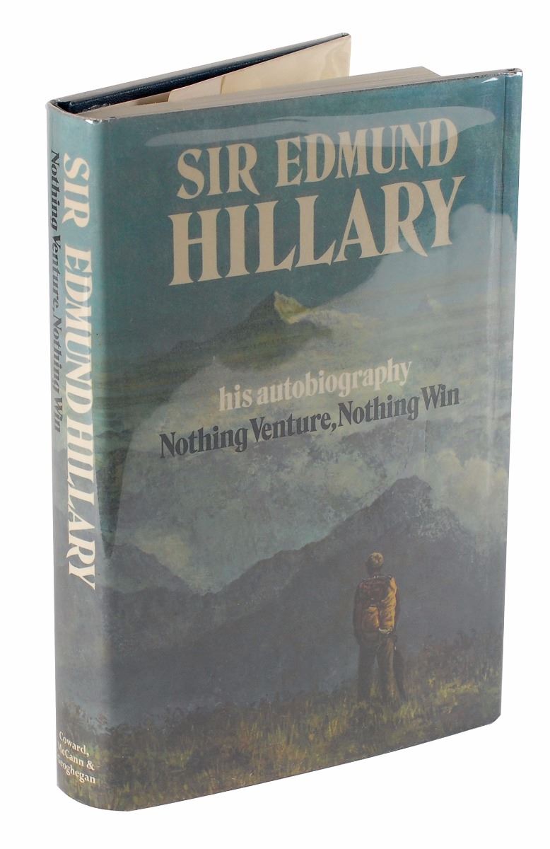 Signed book: Sir Edmund Hillary: Nothing Venture, Nothing Win. First edition. NY: Coward, McCann & Geoghegan, Inc., 1975. Hardcover with dust jacket, 6.5 x 9.5, 319 pages. Signed on three photos individually tipped into the half-title page, the rear pastedown, and the reverse of the first free end page, each signed in ink or ballpoint, “Ed Hillary.” Also tipped into the front pastedown is a signed photo of Colonel John Hunt, the leader of the 1953 British expedition to Mount Everest. In fine condition, with trimmed edges to the photos.