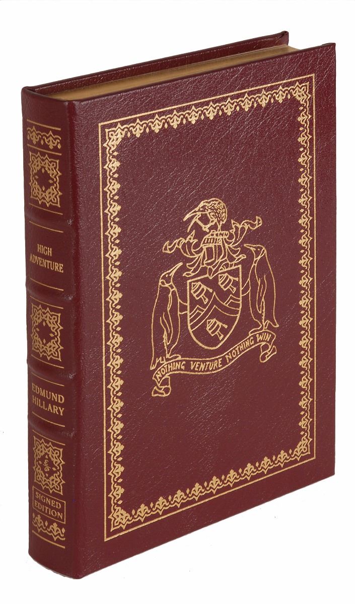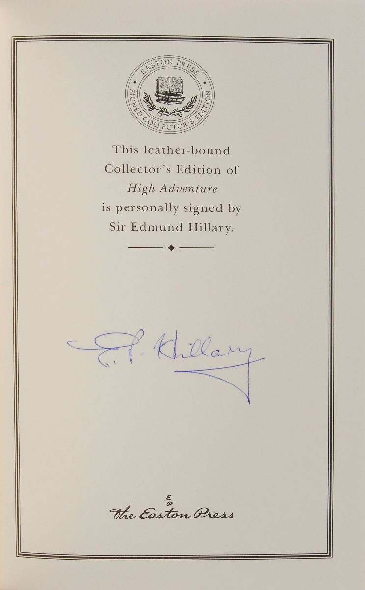 Signed book: High Adventure. Collector’s edition. Norwalk, CT: Easton Press, 2003. Hardcover, 6.5 x 9.5, 245 pages. Crisply signed on the colophon in blue ballpoint, “E. P. Hillary.” In fine condition.