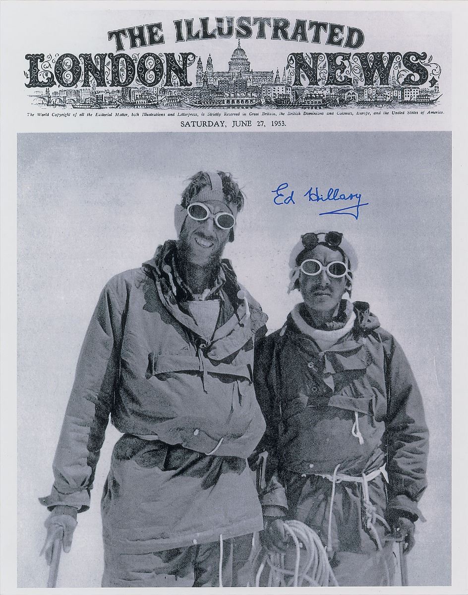 Satin-finish 11 x 14 photo of the front page of The Illustrated London News from June 27, 1953, depicting Hillary posing next to Tenzing Norgay, signed in blue felt tip, "Ed Hillary." In fine condition. On May 29, 1953, Hillary and Nepalese Sherpa mountaineer Tenzing Norgay became the first climbers to successfully reach the summit of the world's highest mountain. Following his historic climb, Hillary devoted most of his life to helping the Sherpa people, aiding in the construction of many schools and hospitals in Nepal.