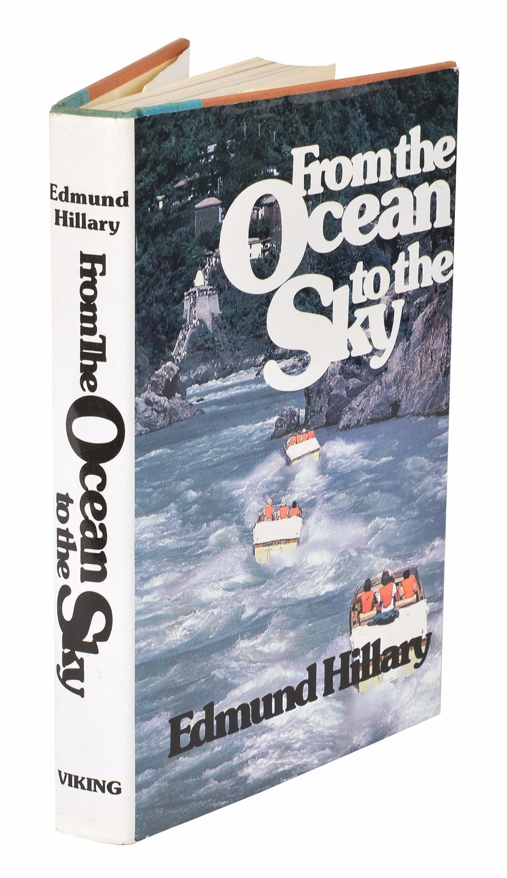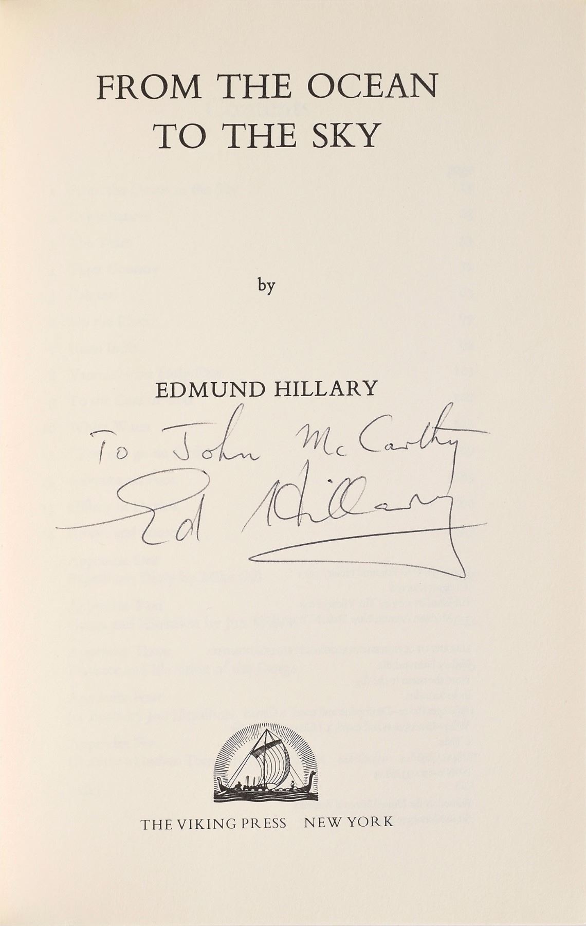 Signed book: From the Ocean to the Sky. NY: Viking Press, 1979. Hardcover with dust jacket, 6.5 x 9.5, 273 pages. Signed and inscribed on the title page in black ballpoint, "To John McCarthy, Ed Hillary." In fine condition.