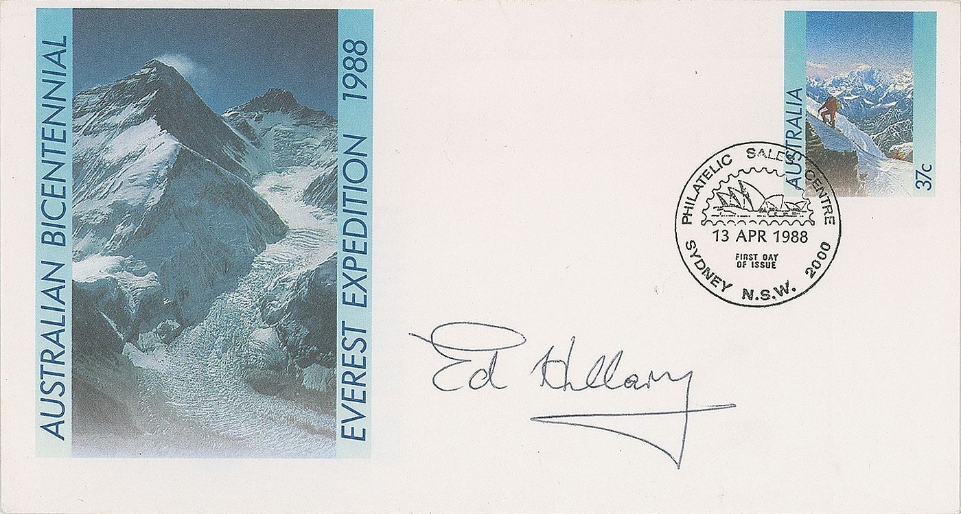 Attractive commemorative cover, 7.5 x 4, with a color cachet honoring the Australian Bicentennial Everest Expedition of 1988, signed in black ballpooint, "Ed Hillary." In fine condition.