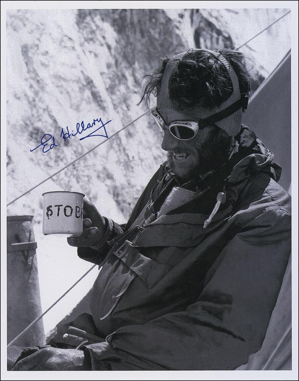 Satin-finish 11 x 14 photo of Hillary enjoying a beverage during his expedition, signed in blue felt tip. In very fine condition.