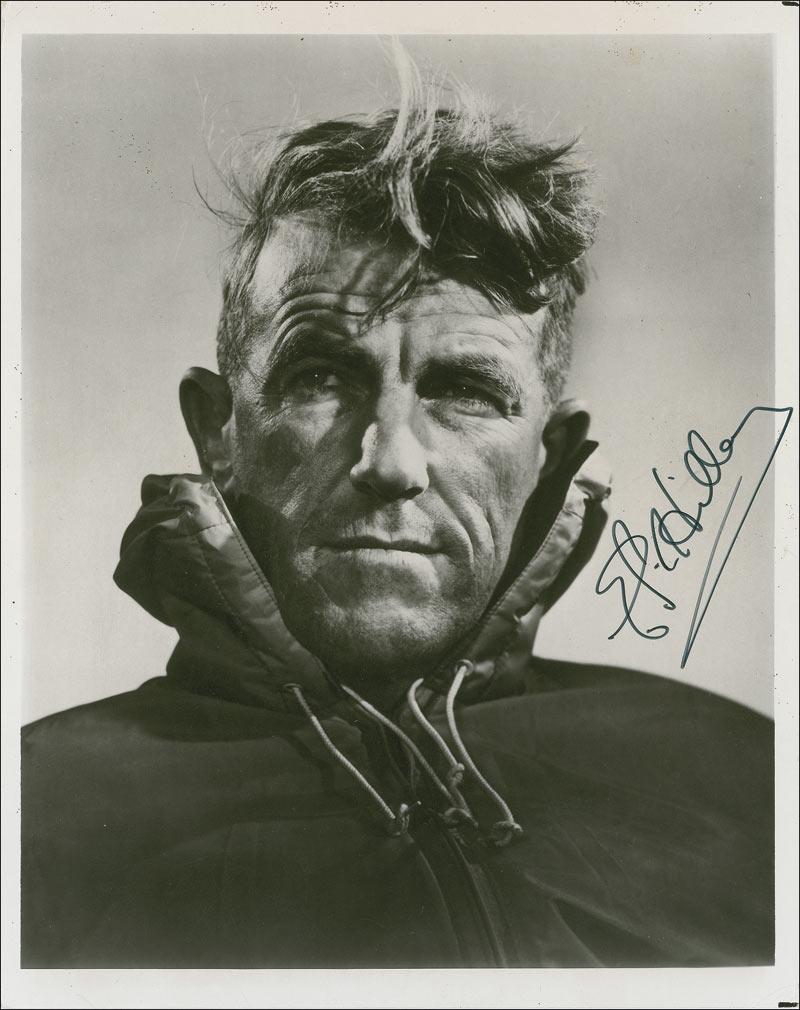 Glossy 8 x 10.25 portrait of Hillary dressed ready to face the elements, signed in black felt tip. Light scattered creases, surface marks, and scratches, otherwise fine condition.