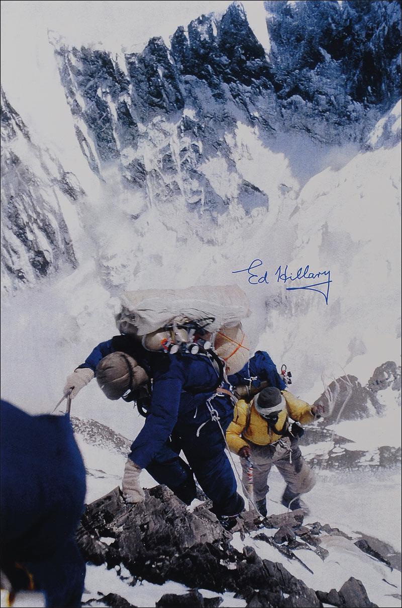 Color satin-finish 12 x 18 photo of Hillary making his ascent, signed in blue felt tip, “Ed Hillary.” In fine condition.