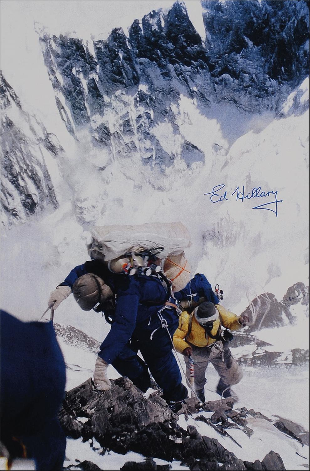 Color satin-finish 12 x 18 photo of Hillary and Norgay ascending Mount Everest, signed in blue felt tip, “Ed Hillary.” In very fine condition.
