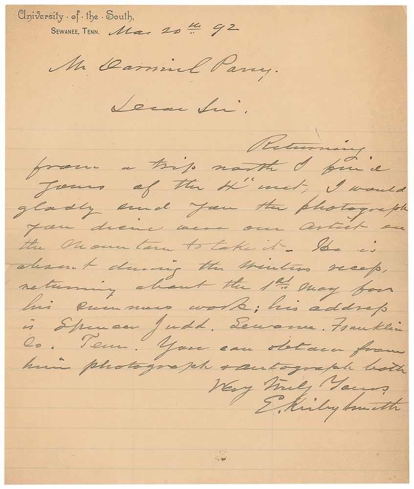 American military officer (1824–1893) who, after serving as lieutenant and captain in the Mexican-American War, became an officer in the Confederate Army. A key participant at Bull Run and Richmond, he was placed in charge of the Trans-Mississippi Department in 1863 and ultimately reached the rank of full general. After taking the Oath of Amnesty following the war, he became president of the Atlantic Telegraph Company and later resumed his academic career as a mathematician. ALS signed “E. Kirby Smith,” one page, lightly-lined, 7.75 x 9.25, University of the South, Sewanee, Tenneessee letterhead, March 20, 1892. Letter to Daniel Parry. In part: “I would gladly send you the photograph you desire were our artist on the mountain to take it. He is absent during the winter recess, returning about 1st May for his summer’s work.” In fine condition, with intersecting folds, one vertical fold passing through a single letter of the signature, and overall toning.