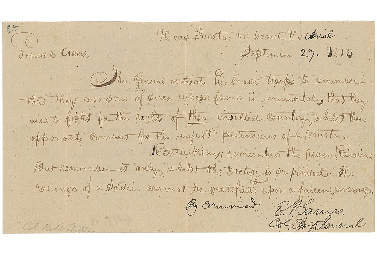War-dated manuscript general orders, signed “By command, E. P. Gaines, Col. Adjt. General,” one page, 7.5 x 4.25, September 27, 1813. An invigorating message issued on board the Arial. In full: “The General entreats his brave troops to remember that they are sons of sires whose fame is immortal, that they are to fight for the rights of their insulted country, whilst their opponents combat for the unjust pretensions of a master. Kentuckians; remember the River Raisin: But remember it only whilst the victory is suspended. The revenge of a soldier cannot be gratified upon a fallen enemy.” Docketing on the reverse reads: “This order issued & was communicated just as the troops embarked from the Sister Island & the same day landed on the Canada Shore, but the enemy had gone.” In fine condition, with two vertical folds (one vertical fold passing through a single letter of the signature).