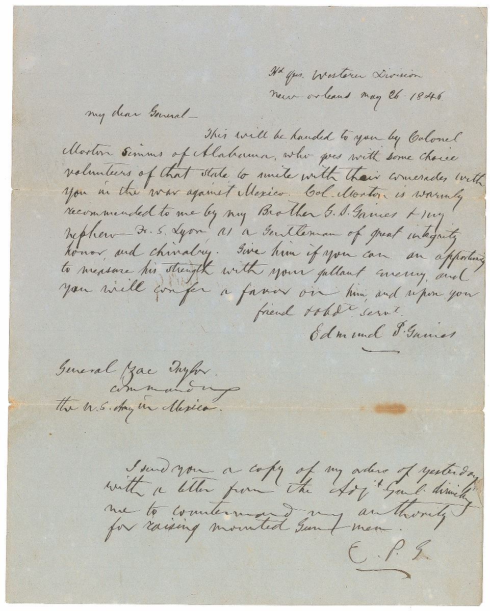 ALS, one page, 7.75 x 10, May 26, 1846. Letter to the future president, “General Zac. Taylor, the U.S. Army in Mexico.” In full: “This will be handed to you by Colonel Morton Simms of Alabama, who goes with some choice volunteers of that state, to unite with their comrades with you in the war against Mexico. Col. Morton is warmly recommended to me by my brother G. S. Gaines & my nephew H. S. Lyon, as a gentleman of great integrity, honor, and chivalry. Give him if you can an opportunity to measure his strength with your gallant enemy and you will confer a favor on him.” He adds an important postscript, “I send you a copy of my orders of yesterday from the Adjt. Genl. directing me to countermand my authority for raising mounted Gun men.” In very good to fine condition, with scattered overall creasing and a small stain along fold.