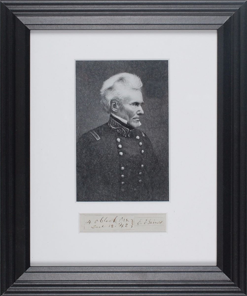 Army officer who served with distinction during the War of 1812, the Seminole Wars, and the Black Hawk War (1777–1849). Ink signature, “4 o’clock PM, Dec’r 12, ’42, E. P. Gaines,” on two small slips affixed side-by-side to a card, matted and framed with a portrait to an overall size of 10 x 12. In fine condition, with some scattered staining.