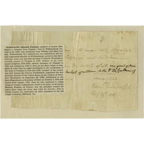 <B>Edmund Randolph Signature and an incomplete Autograph Document Signed.</B></I> The signature in this lot measures 4" x 1" and appears as, "<I>Edm: Randolph.</B></I>" Randolph signs the ADS as "<I>Edm: Randolph.</B></I>" The ADS is 1 page, 7.5" x 4.5", np, February 19, 1787. In part, "<I>Gent: Be pleased to send by bearer twenty wt. of single sugar, six lbs. of brown, one wash hand basin, one bottle of mustard & a bottle of oil, one quart of painters oil, and ½ bushel of alum salt & 2 ½ gallons of molasses…</B></I>" Randolph, a delegate from Virginia, served in the Revolutionary Army and was aide-de-camp to General Washington; attorney general of Virginia in 1776; Member of the Continental Congress 1779-1782; first attorney general of the United States in Washington's Cabinet. Randolph also served as defense lawyer for Aaron Burr during his treason trial. <BR><BR>The document and signature are in Fine condition. Both have been clipped from larger documents. The ADS is creased at folds and has uneven edges: a small printed biography of Randolph has been affixed to the page as well. From the Henry E. Luhrs Collection. Accompanied by LOA from PSA/DNA.