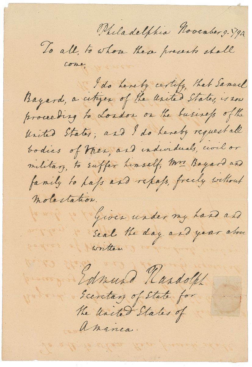American politician (1753–1813) who served as both attorney general and secretary of state in George Washington’s cabinet. Boldly penned ADS, signed “Edmund Randolph, Secretary of State for the United States of America,” one page, 8 x 11.5, November 9, 1794. Diplomatic passport issued to Samuel Bayard. In full: “To all to whom there presents shall come, I do hereby certify, that Samuel Bayard, a citizen of the United States, is now proceeding to London on the business of the United States; and I do hereby request all bodies of Men, and individuals, civil or military, to suffer himself, Mrs Bayard and family to pass and repass, freely without molestation. Given under my hand and seal the day and year above written.” In fine condition, with noticeable mirroring of ink. Accompanied by an unsigned engraved portrait.