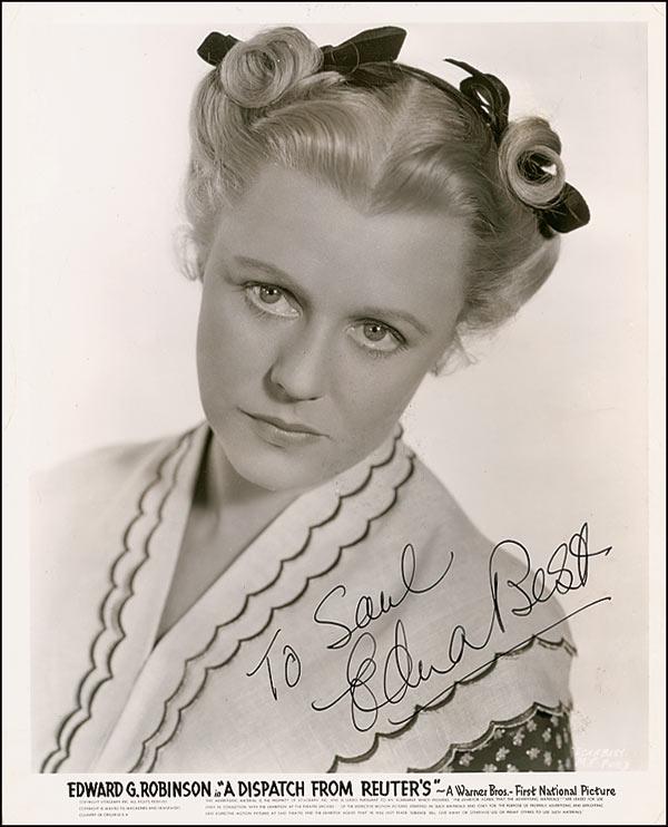 British actress (1900–1974) best remembered for her role as the mother in the original 1934 film version of Alfred Hitchcock's The Man Who Knew Too Much. Vintage glossy 8 x 10 Warner Bros. promotional photo for A Dispatch From Reuter’s, signed and inscribed in-person in fountain pen “To Saul, Edna Best.” Reverse of photo bears collector’s ink date notation of February 27, 1954, the date the signature was acquired. In very good condition, with scattered creases and surface marks, and some mild rippling to emulsion. The Saul Goodman collection.