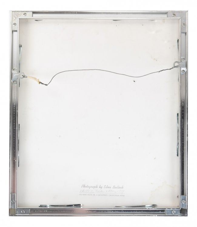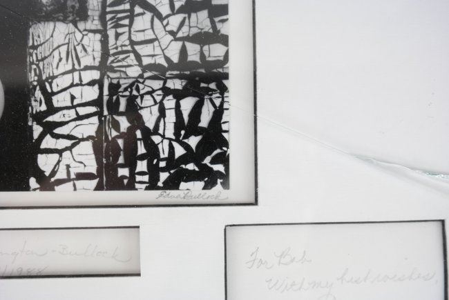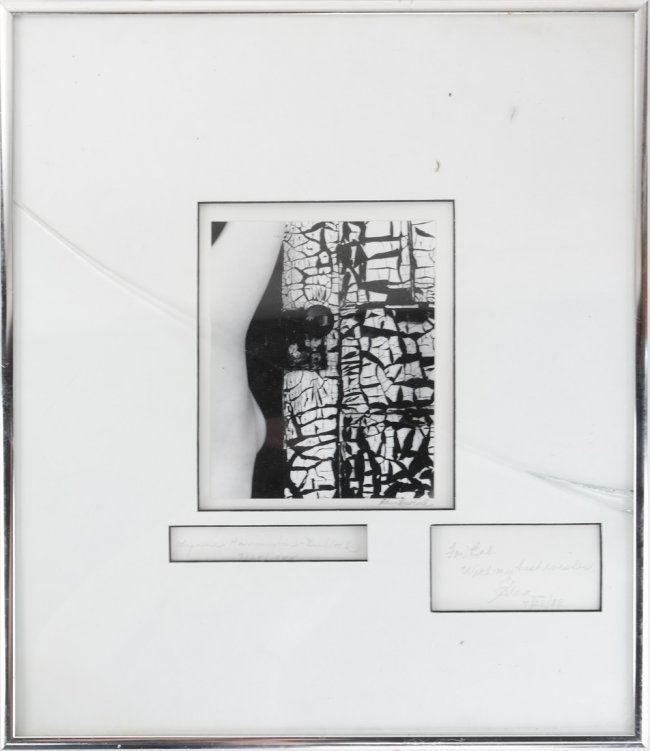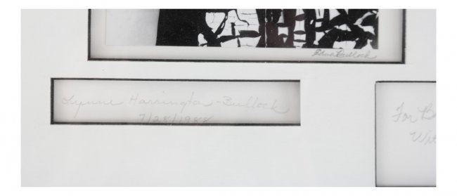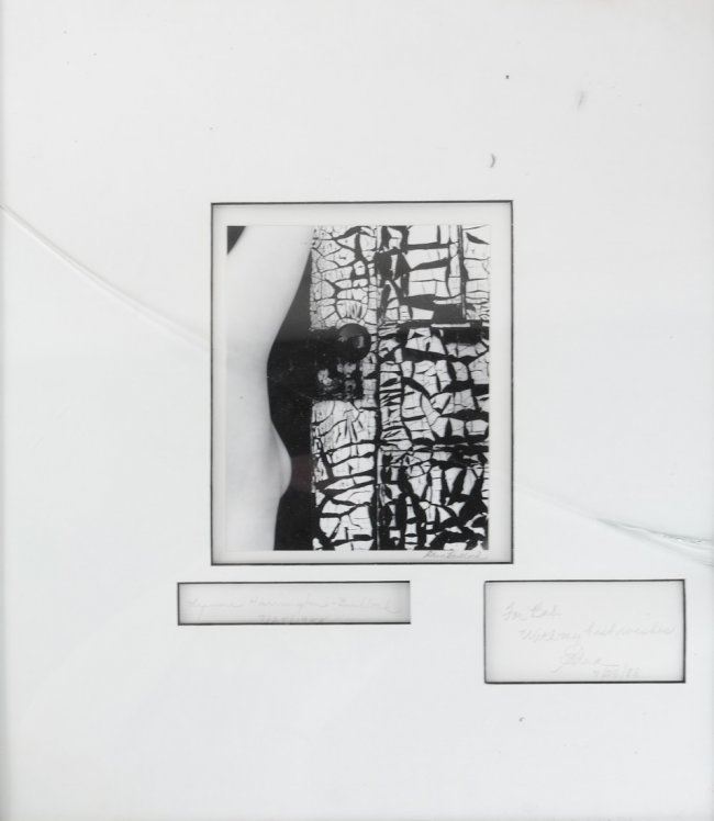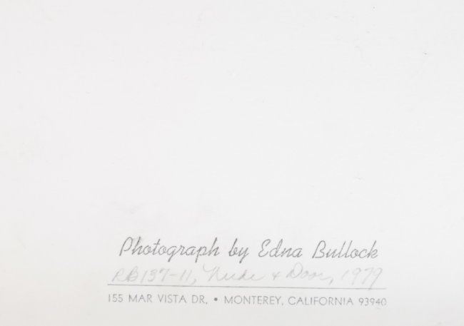 Edna Bullock (American 1915-1997) nude photograph "Lynn Harrington Bullock" in pencil. Signed "Edna Bullock" in pencil in the lower right. [Sight: 6 1/4" x 5 1/4" W; Frame: 15" H x 13" W]. Glass on the frame is cracked. In overall good condition.