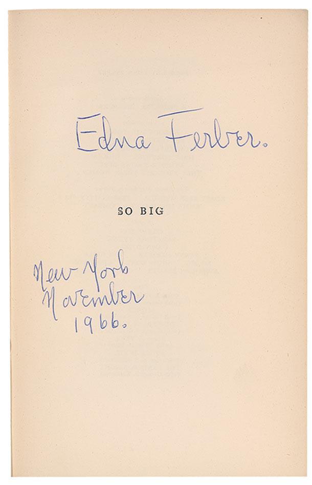 Signed book: So Big. Later printing. Garden City, New York: Doubleday, 1954. Hardcover, 5.75 x 8.5. Signed on the half title page in blue ballpoint “Edna Ferber, New York, November 1966.” Light toning to the pages, scuffing to the boards, and a somewhat misaligned spine, otherwise fine condition.