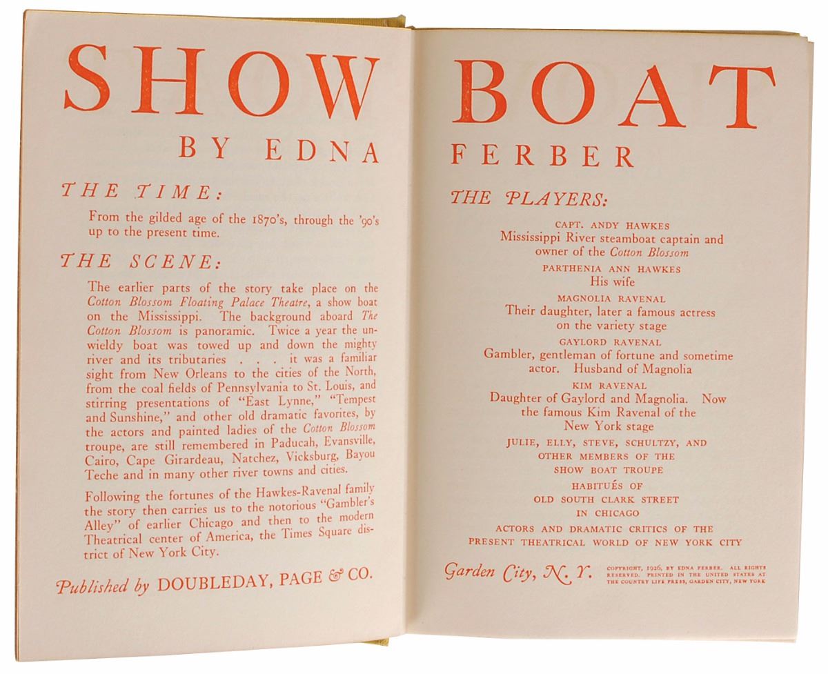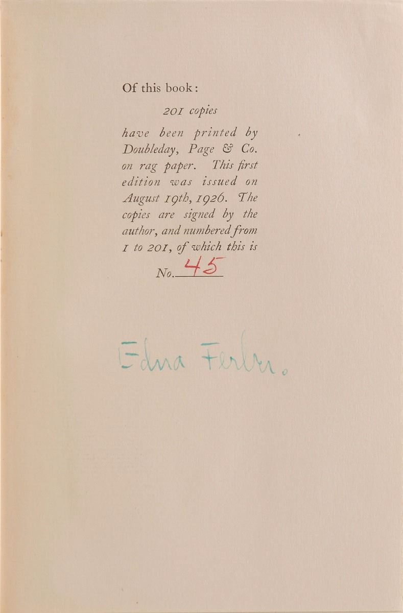 Two books: a signed first edition hardcover of Show Boat, with slipcase, limited issue numbered 45/201, published in 1926 by Doubleday, signed on the colophon in green ink; and a scarce unsigned ‘publisher’s dummy’ of the standard first edition hardcover of Show Boat, consisting of a blurb, title page, and first two pages, with the remaining pages left blank. In overall very good to fine condition.