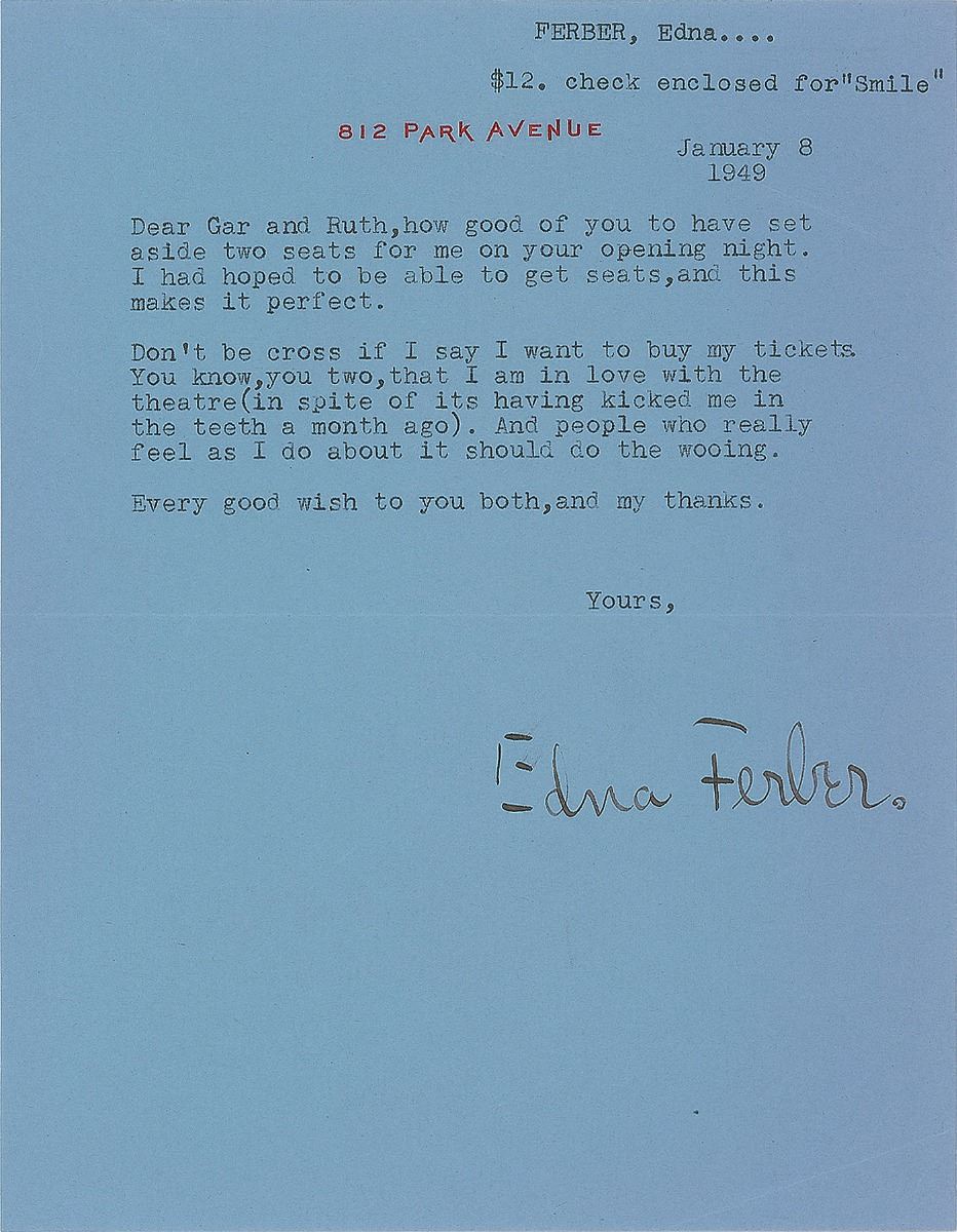 TLS, one page, 6.25 x 8, 812 Park Avenue letterhead, January 8, 1949. Letter to Gar and Ruth, in full: “How good of you to have set aside two seats for me on your opening night. I had hoped to be able to get seats, and this makes it perfect. Don’t be cross if I say I want to buy my tickets. You know, you two, that I am in love with the theatre (in spite of its having kicked me in the teeth a month ago). And people who really feel as I do about it should do the wooing. Every good wish to you both, and my thanks.” In fine condition.
